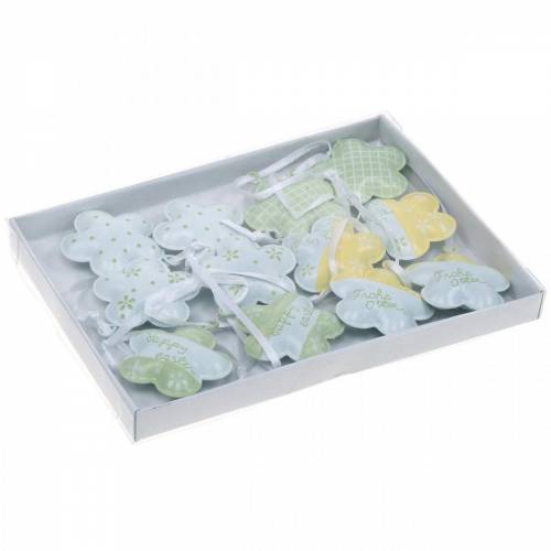 Décorations de Pâques sonores à suspendre: Les petites fleurs en métal en blanc, vert et jaune sont de jolies décorations pour le printemps!Avec de jolis motifs tels que des points, des fleurs et des voeux de Pâques en allemand et en anglais, les étiquettes métalliques de la marque de décoration VIANA offrent une grande variété. Les fleurs sont bombées et il y a une petite cloche à l'intérieur. Le dos est blanc monochrome ou vert clair.