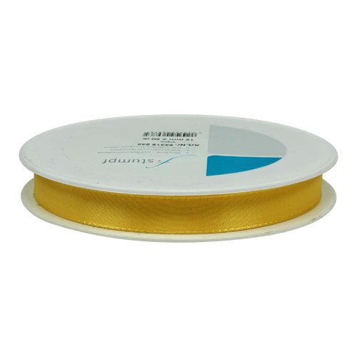 Das gelbe Geschenk- und Dekorationsband aus 100% Polyamid ist ungefähr 15 Millimeter breit und etwa 50 Meter lang. Es ist auf einer handlichen Kunststoff-Spule aufgewickelt.