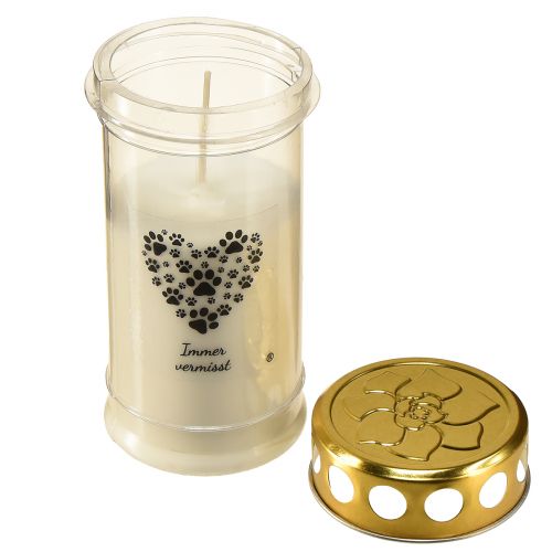 La nostra candela commemorativa per cani in bianco con coperchio dorato misura 7 cm di diametro e raggiunge un'altezza di 16,5 cm. Come luce per tomba di animali domestici, simboleggia l'amore e la connessione oltre la morte ed è stata progettata per bruciare a lungo. Il coperchio con il motivo floreale aggiunge un accento speciale e protegge la luce nelle giornate ventose e piovose.