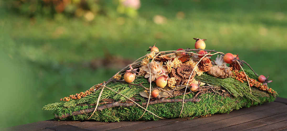 Entdecken Sie Luffa und Moose als vielseitige Naturdeko. Normalerweise besteht Grabschmuck aus lebenden Pflanzen: Stiefmütterchen, Erika und Fleissige Lieschen werden im jahreszeitlichen Wechsel auf das Grab gepflanzt, eine Vase für Schnittblumen und eine Laterne machen den Schmuck vollständig. Das sieht recht trist und langweilig aus, und das muss auch nicht immer so sein. Denn mit ein paar wenigen Gegenständen lässt sich eine besinnliche Grabstätte durchaus ansprechend gestalten, so dass sie zum Verweilen, Beten und Gedenken einlädt. Da sich die Grabstätten normalerweise in der freien Natur befinden, ist natürlichen Materialien stets der Vorzug zu geben.