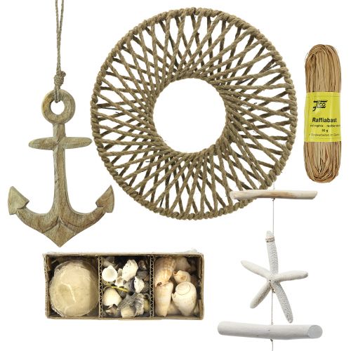Anker, Seestern, Holzdeko und Muscheln – in der DIY-Box ist alles dabei. Der Dekoring mit Jutekordel wirkt in der maritimen Deko ein wenig wie ein Fischernetz, die Naturfaser erinnert an Taue. Ein großer Anker aus unbehandeltem Holz dient als Blickpunkt. Echtes Treibholz und weiße Muscheln als Deko bringen Authentizität.