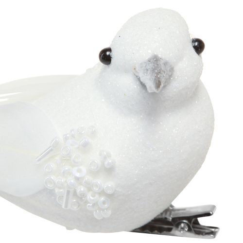 Le couple de pigeons sur le clip mesure environ 22 centimètres de long et environ 5 centimètres de haut. Les corps sont d'un blanc élégant, qui est également fait briller par des paillettes, des perles et des paillettes argentées. Les plumes de la queue et les ailes sont constituées de véritables plumes blanches, dont certaines sont décorées de paillettes.