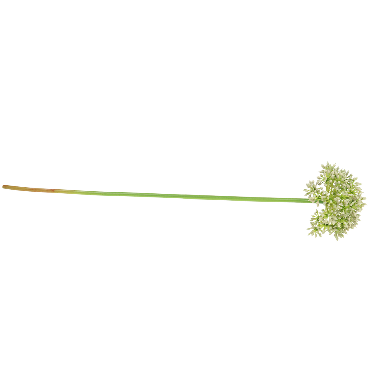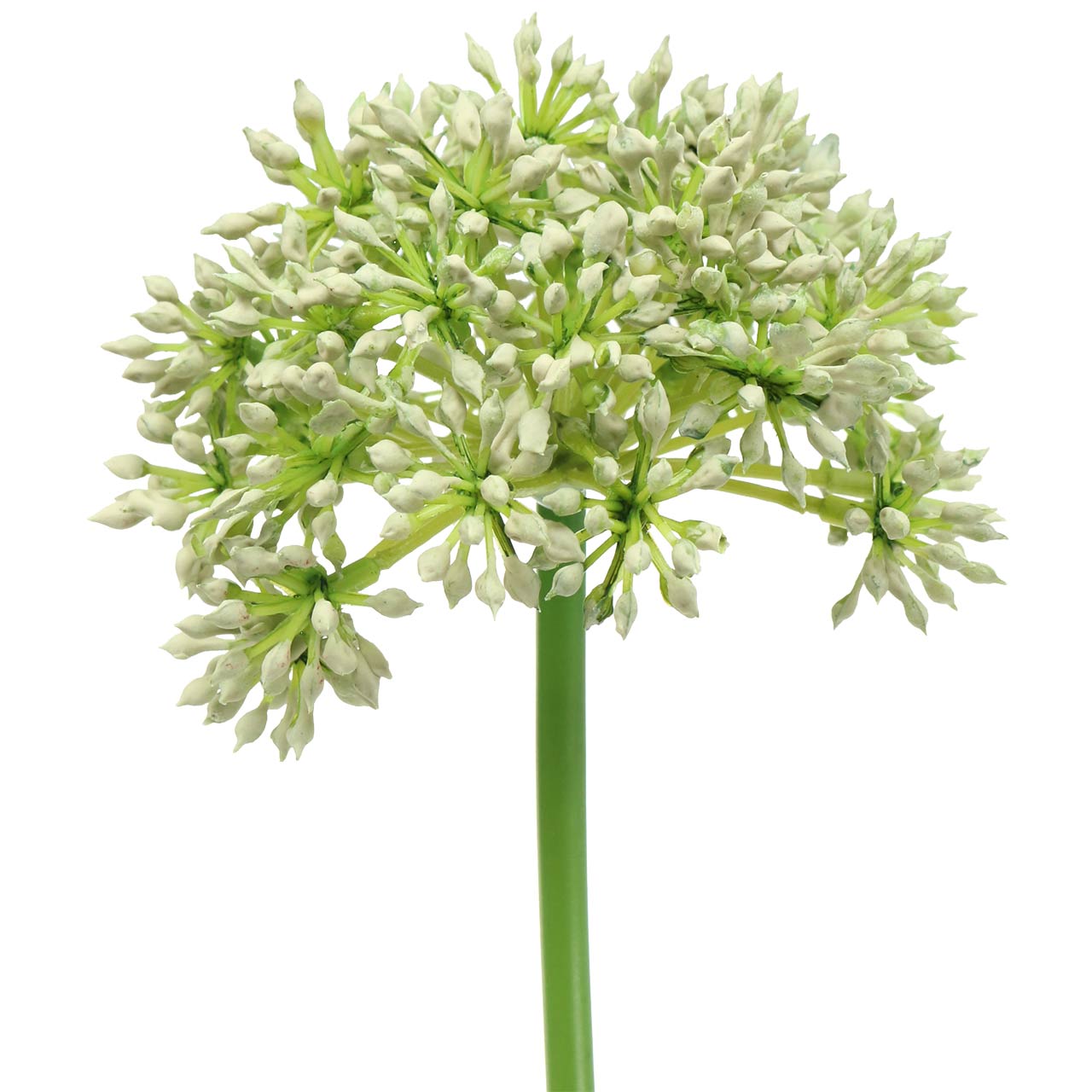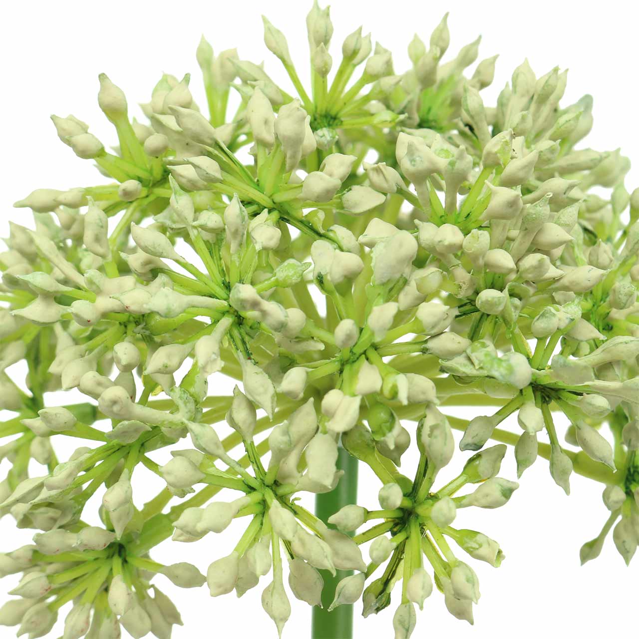 Der künstliche Allium in Weiß ist mit dem Stiel circa 55 Zentimeter lang, wobei der Blütenkopf einen Durchmesser von etwa 11 Zentimetern hat.