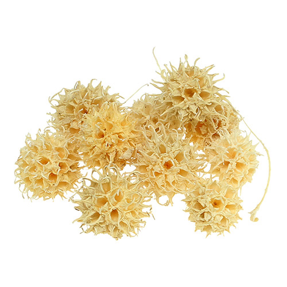 Seule la nature est capable de créer d’aussi belles formes ! Ces fruits tout à fait hors du commun d’un arbre appelé le liquidambar („ambre liquide“) feront sensation dans toutes sortes de décorations en leur donnant une note chic et très exotique. Ces petites boules sont conservées grâce à un processus spécifique puis elles sont séchées et enfin décolorées.Les fruits sphériques du liquidambar sont couverts de petites pointes qui font que cette décoration naturelle ressemble à l’enveloppe hérissée d’une châtaigne. Vous pourrez vous en servir pour donner un cachet incomparable à un arrangement de deuil destiné à la Toussaint, à votre couronne de l’Avent à la veille des fêtes de fin d’année ou encore au décor d’automne de votre vitrine.