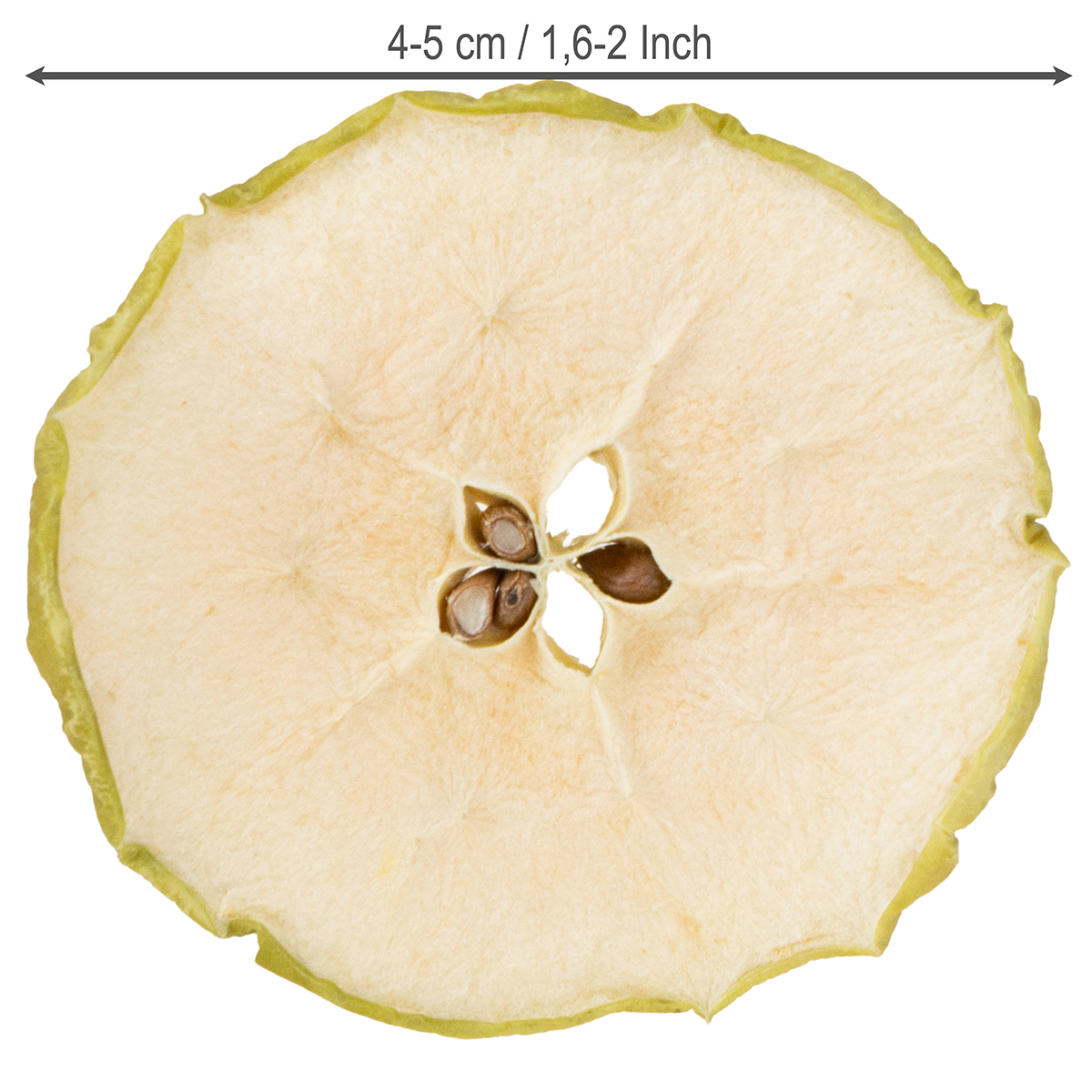 In ogni confezione da 500 grammi ci sono diverse fette di mela rossa da decorare, che sono naturalmente di dimensioni leggermente diverse. Pertanto, i dischi hanno un diametro di circa 4-5 centimetri e sono una decorazione sul runner del tavolo da pranzo un effetto straordinario che non è secondo a nessuno.