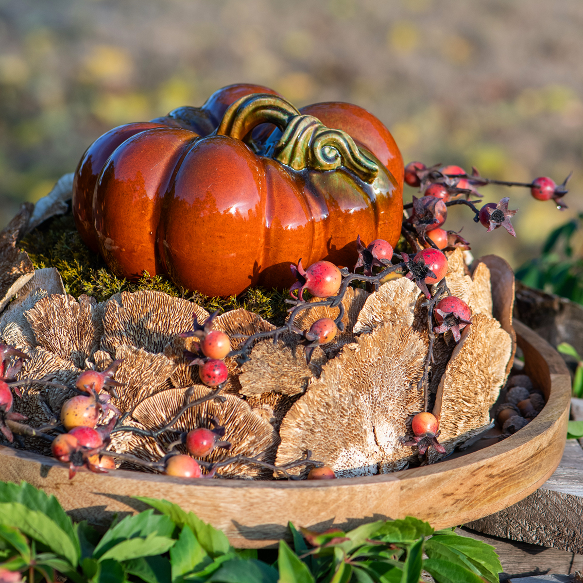 Par exemple, vous pouvez incorporer les champignons séchés et conservés dans un arrangement sec et ainsi assouplir un peu l'arrangement. Le champignon s'intègre particulièrement bien dans une décoration automnale et peut également s'intégrer harmonieusement dans une décoration de vitrine ou une décoration de scène si l'on souhaite créer un univers automnal ou une ambiance forestière.