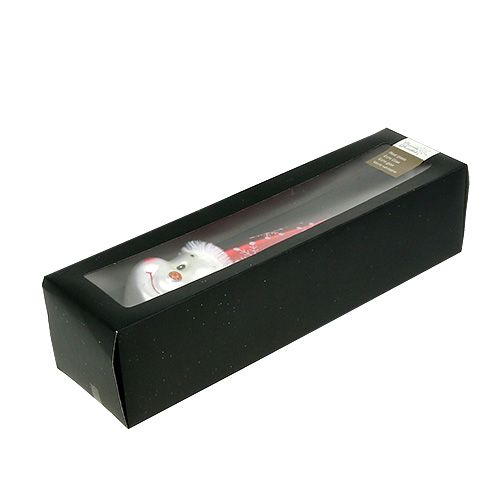 Die Baumspitze aus rot und weiß-silbrig bemaltem Glas ist insgesamt circa 30 Zentimeter lang und bis zur Spitze der Mütze durchgehend hohl. Der Kopf des Schneemanns besitzt einen Durchmesser von ungefähr 7,5 Zentimetern und die Öffnung misst circa 2,5 Zentimeter im Durchmesser. Die Baumspitze ist sicher in einer Box aus Kunststoff und Pappe verpackt.