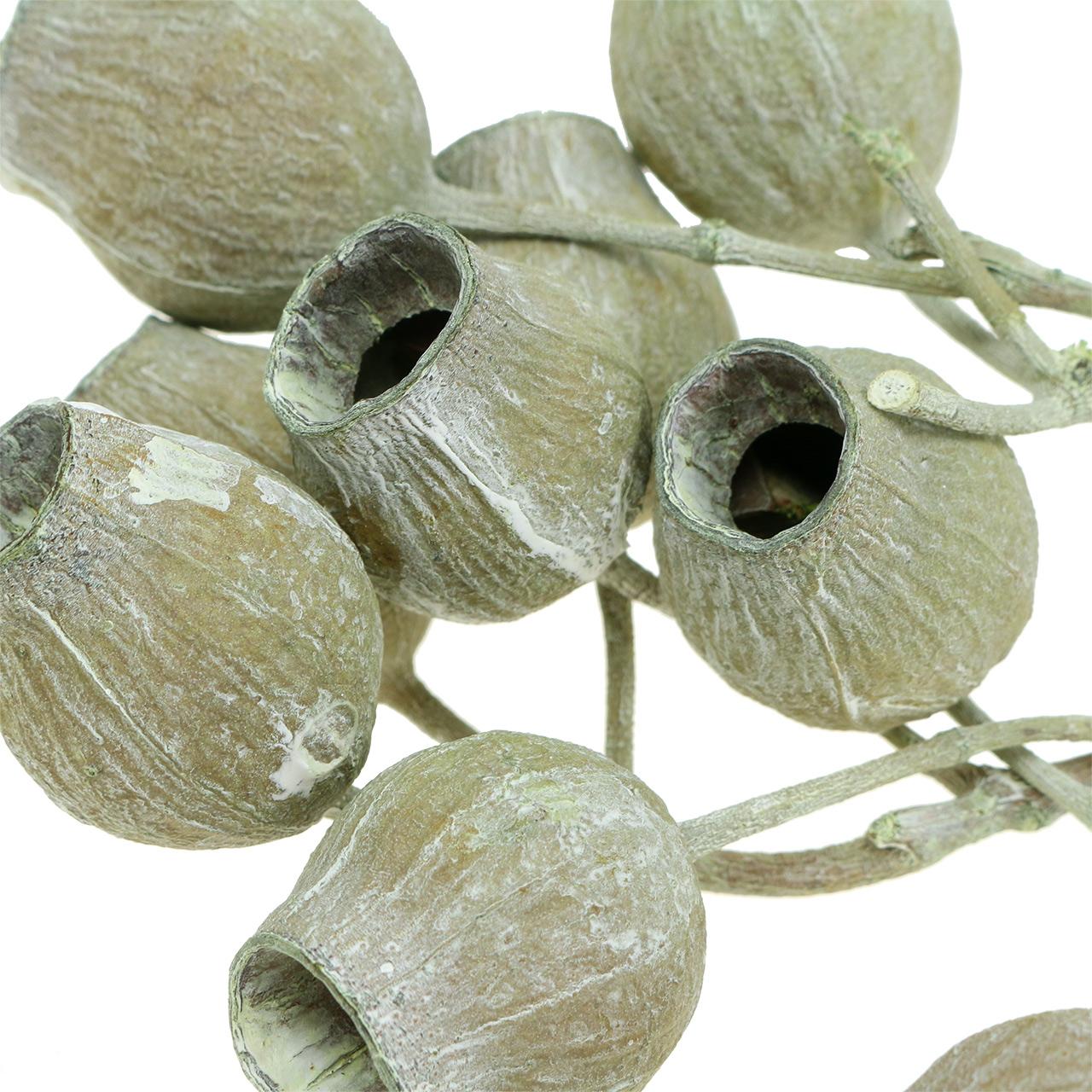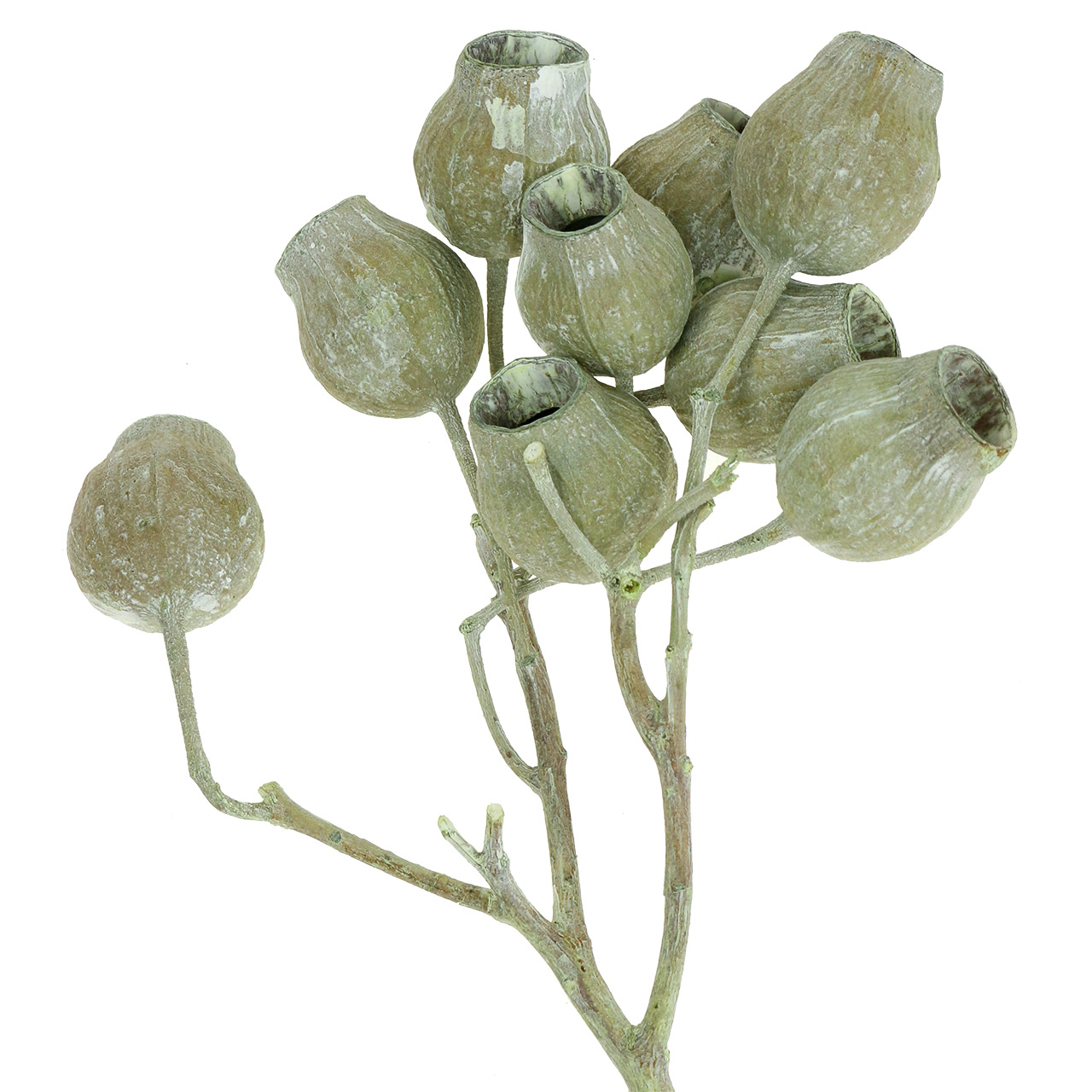 Die Kapselfrucht ist stark verholzt, überaus stabil und lässt sich daher ganz individuell verarbeiten. Ganz sanft wurden sie in grün gefärbt und mit einem besonderen Effekt versehen, sodass der Zweig aussieht, als wäre er gefrostet worden Sie erhalten die Dekozweige mit Fruchtbestand in einer Packung zu 20 Stück geliefert. Jede Frucht ist etwa zwischen 2 und 5 Zentimeter groß.