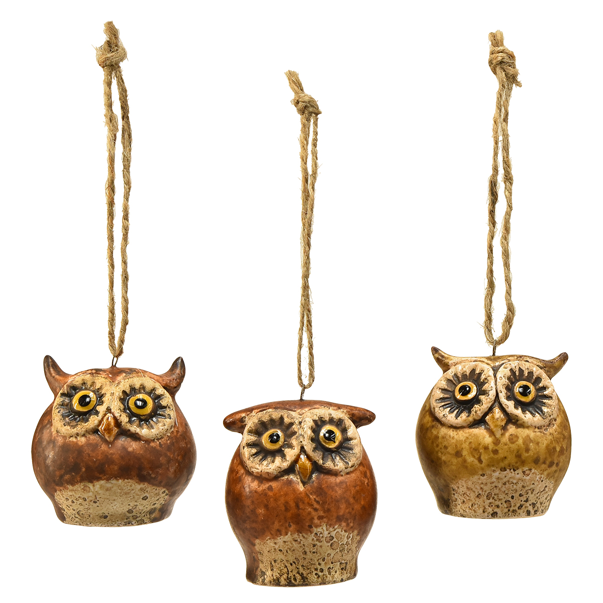- Trois pendentifs décoratifs en forme de hibou dans différentes nuances de marron