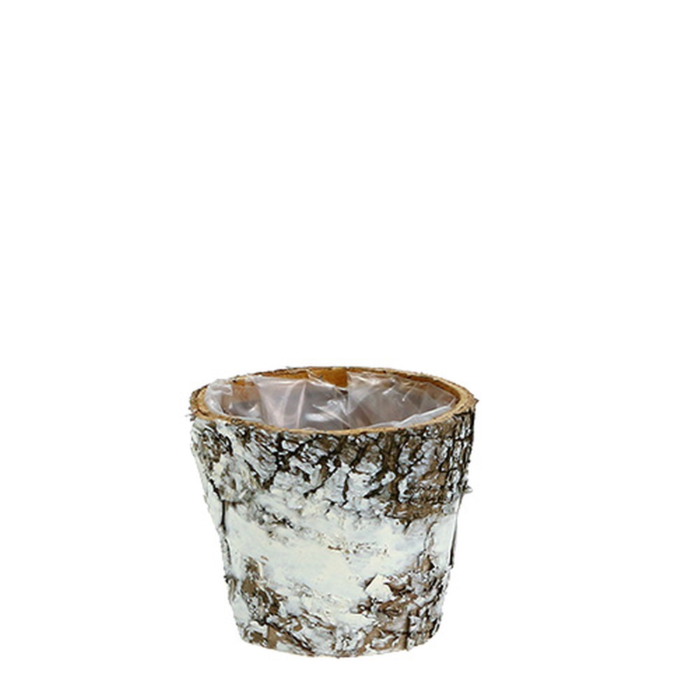 Der kleine Blumentopf begeistert mit einem rustikalen, natürlichen Look, denn er besteht aus teilweise weiß bemalter Birkenrinde und leichtem Spanholz und passt somit hervorragend zu einer urigen Dekoration im Landhausstil.