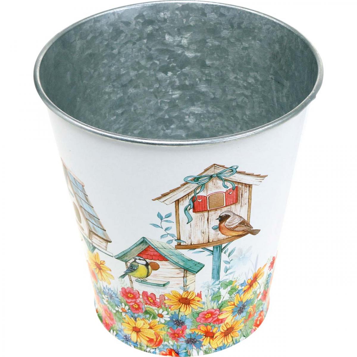 Vaso in latta con casette per uccelli, decorazione estiva, fioriera H14,5 cm Ø13,5 cm