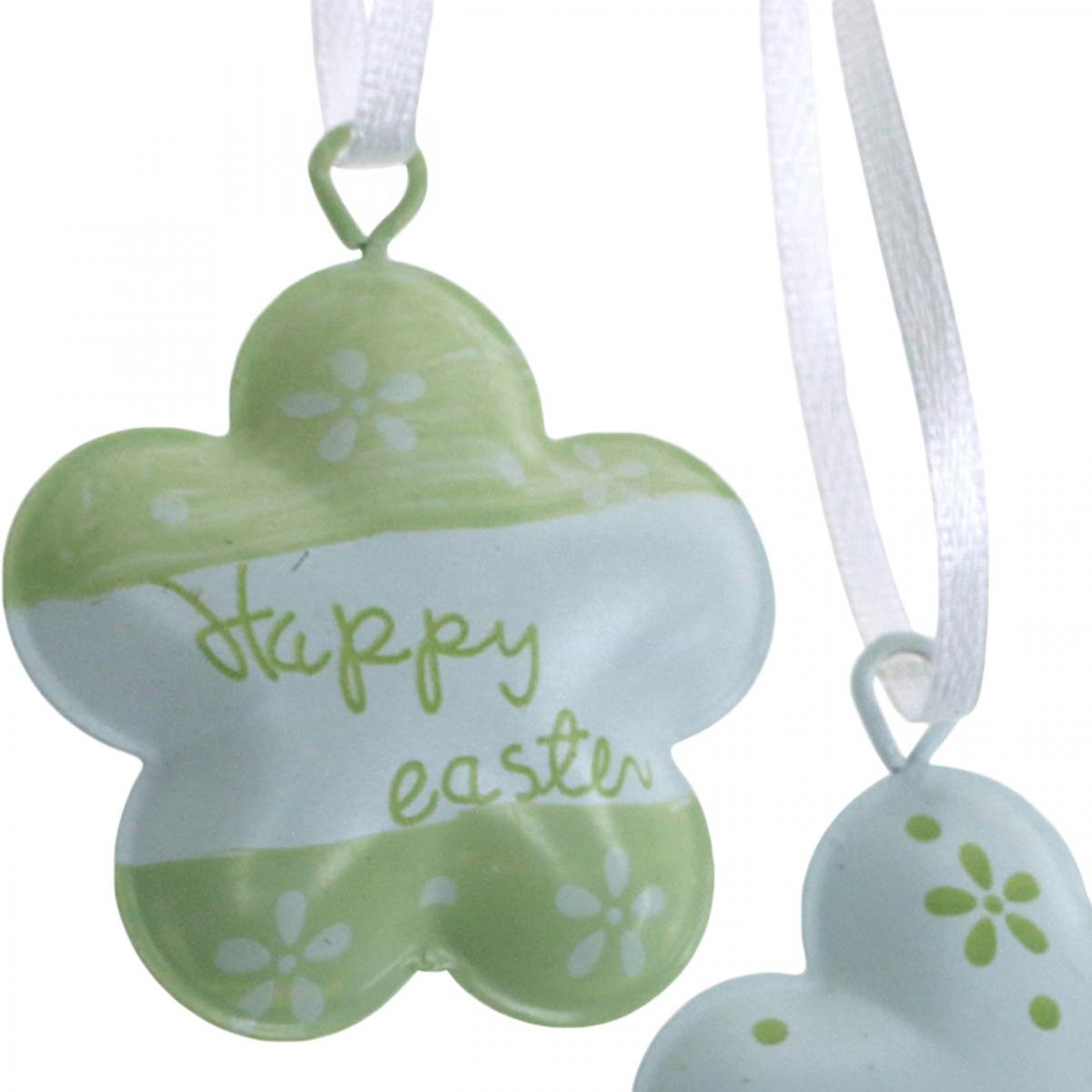 Décorations de Pâques sonores à suspendre: Les petites fleurs en métal en blanc, vert et jaune sont de jolies décorations pour le printemps!Avec de jolis motifs tels que des points, des fleurs et des voeux de Pâques en allemand et en anglais, les étiquettes métalliques de la marque de décoration VIANA offrent une grande variété. Les fleurs sont bombées et il y a une petite cloche à l'intérieur. Le dos est blanc monochrome ou vert clair.