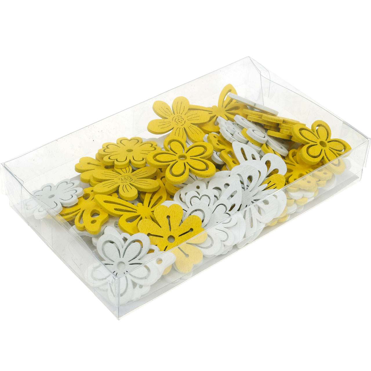 Produktname: Blumen und Schmetterlinge zum Streuen Gelb, Weiß Holz Streudeko Frühlingsdeko 72 St