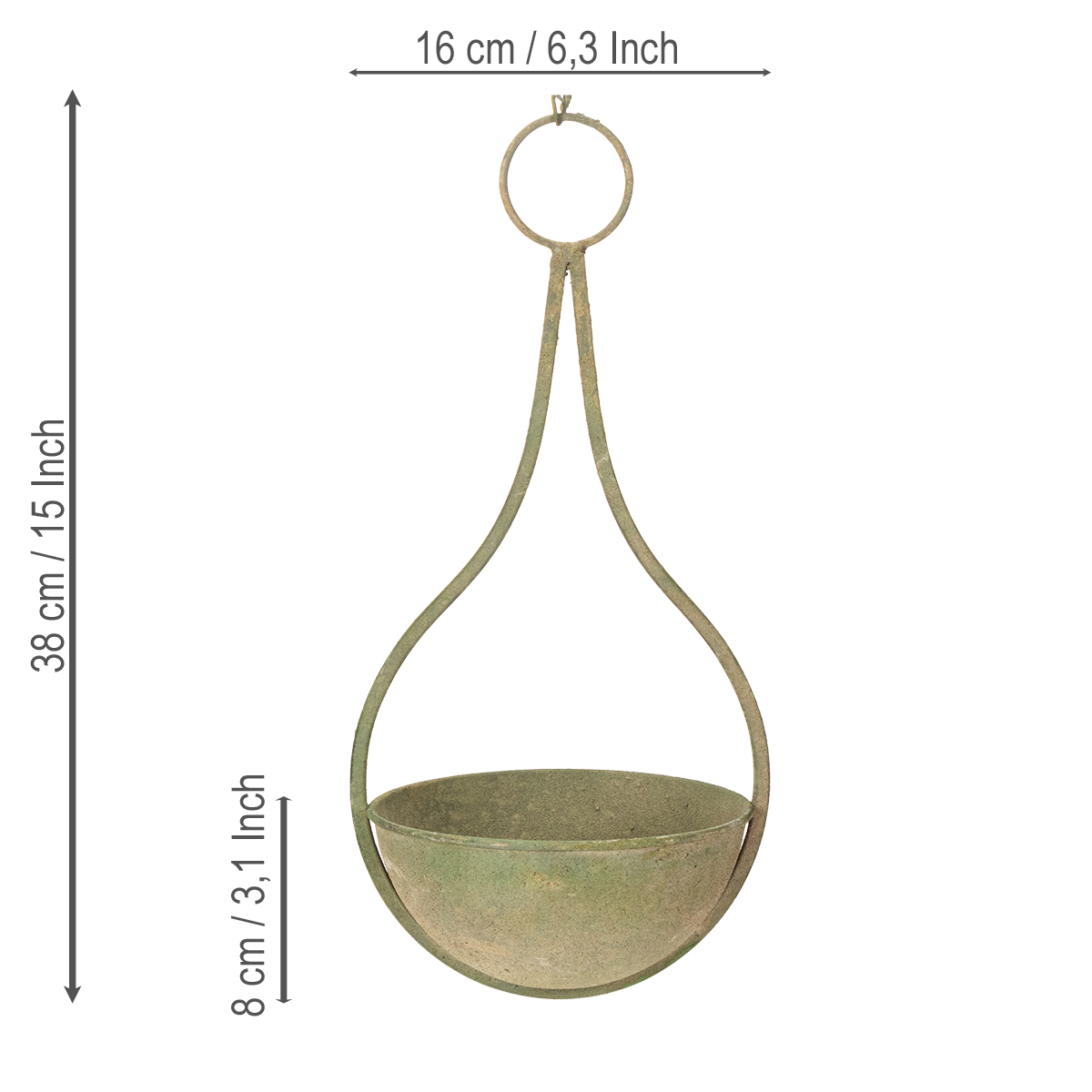 Ce panier suspendu rustique en gris-vert est une merveilleuse décoration en métal pour le jardin. Le panier suspendu polyvalent peut également être utilisé à merveille sur votre balcon, votre terrasse ou à l'intérieur.Le panier suspendu en métal se compose d'un bol rond qui est maintenu par un arc circulaire qui converge vers le haut.