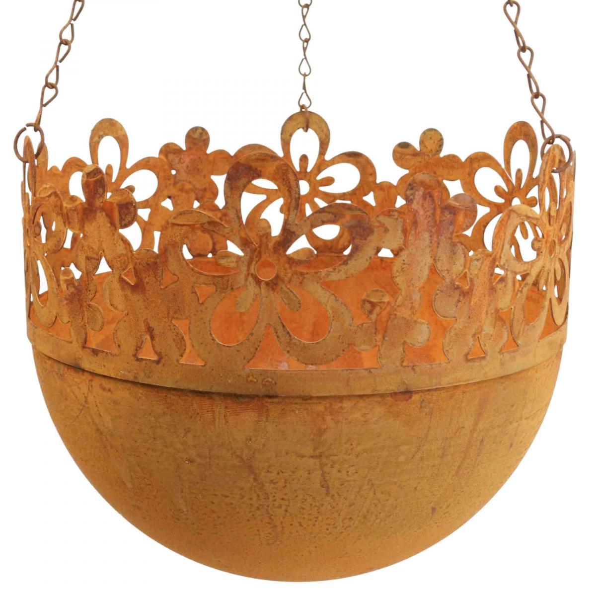 Il bordo decorativo di questo cestino da appendere in metallo presenta fiori a cinque petali. Il colore marrone ruggine rende speciale anche la decorazione in metallo con un aspetto ruggine.Tre catenelle, collegate da un gancio, stabilizzano la ciotola decorativa e allo stesso tempo ne consentono l'aggancio. Il bordo decorativo ha un'altezza di circa sei centimetri. La ciotola rotonda senza bordo decorativo è alta una decina di centimetri. Ciò si traduce in un'altezza totale di circa sedici centimetri.
