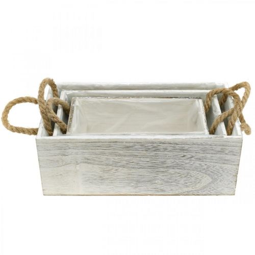 Sie erhalten 3 unterschiedlich große Pflanzbehälter der Qualitätsmarke VIANA zusammen im Set. – Kombinieren Sie die Holzgefäße im Vintage-Look auch mit anderen Deko-Kisten zum Bepflanzen aus unserem vielfältigen Sortiment an Blumengefäßen.