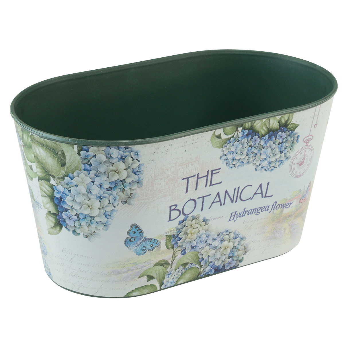 Das nostalgische Motiv mit vielen blauen Hortensien ist auf eine hochwertige Folie gedruckt, die die Außenseite des grünen Pflanzkübels bis auf den Rand passgenau bedeckt. Die ovale Schale zeichnet sich dadurch aus, dass Sie aus robustem Kunststoff gefertigt ist.