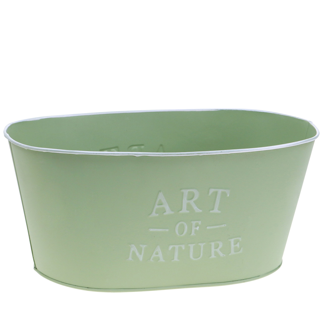 Die ovale Blumenschale aus Zink mit der Aufschrift „Art of Nature“ hat oben die ungefähren Maße 27 × 18 Zentimeter. Die