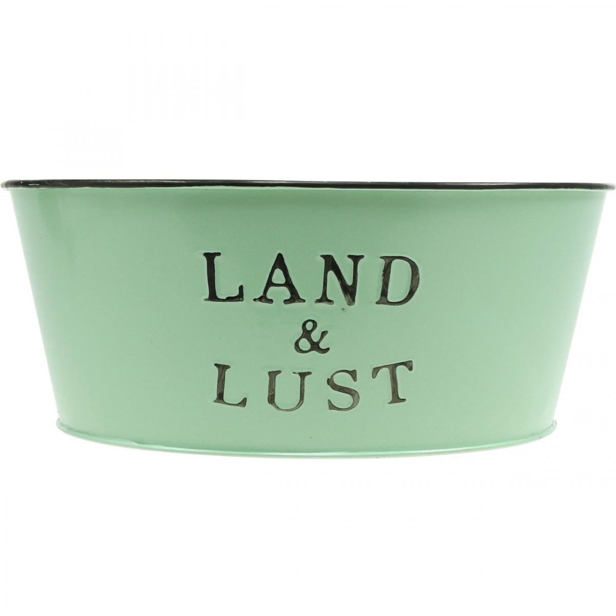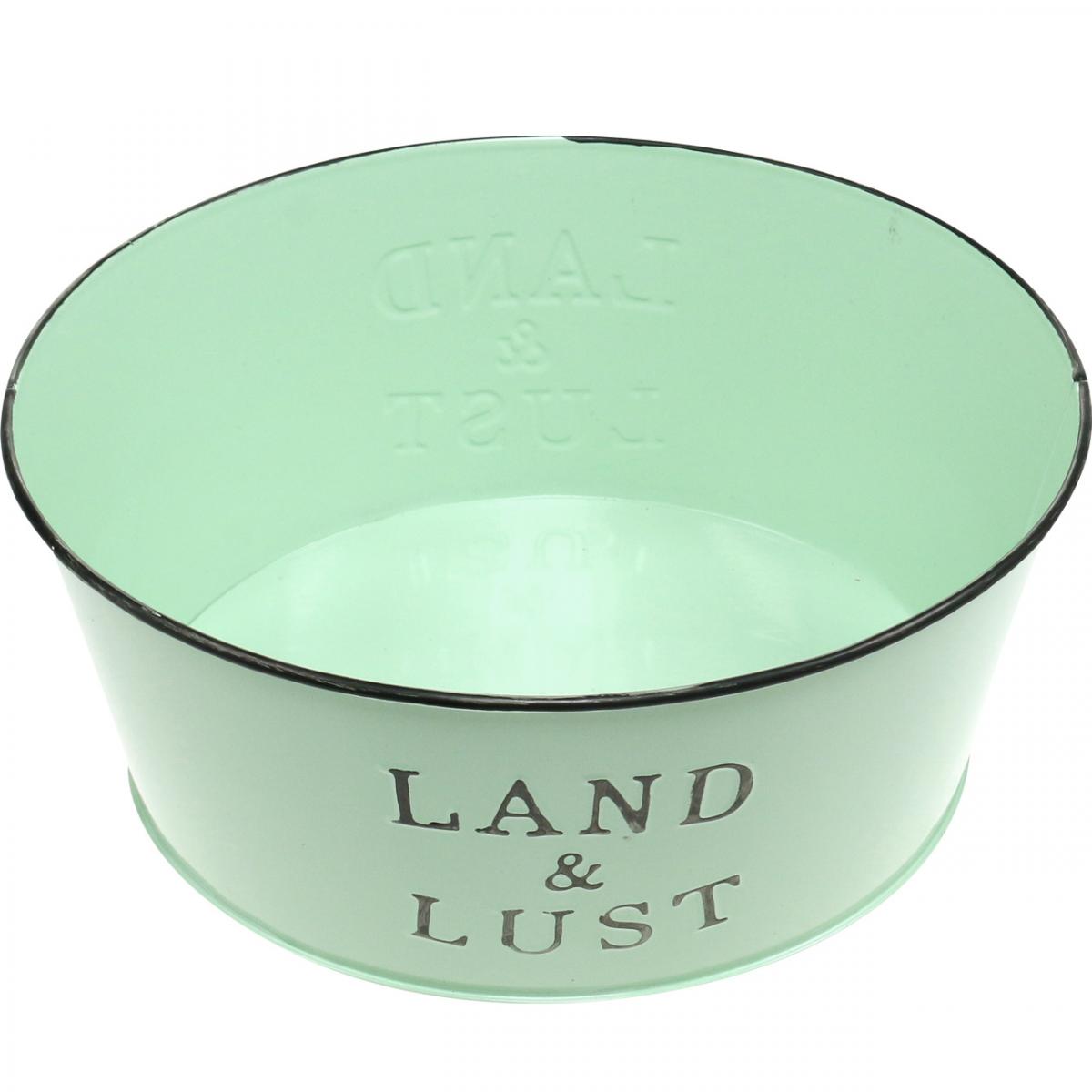 Gestalten Sie in der runden Blumenschale in Mint eine frühlingsfrische Pflanzenwelt! Das Pflanzgefäß aus Metall in angesagt hellem Mintgrün wirkt durch den schwarzen Rand mit seinen Abriebspuren und dem aufgeprägten Schriftzug „Land & Lust“ zugleich modern und nostalgisch. Am besten kleiden Sie den Metalltopf gleich mit Pflanzfolie aus. So vermeiden Sie bei der Verwendung als Pflanzgefäß das Risiko von Schäden durch Feuchtigkeit.