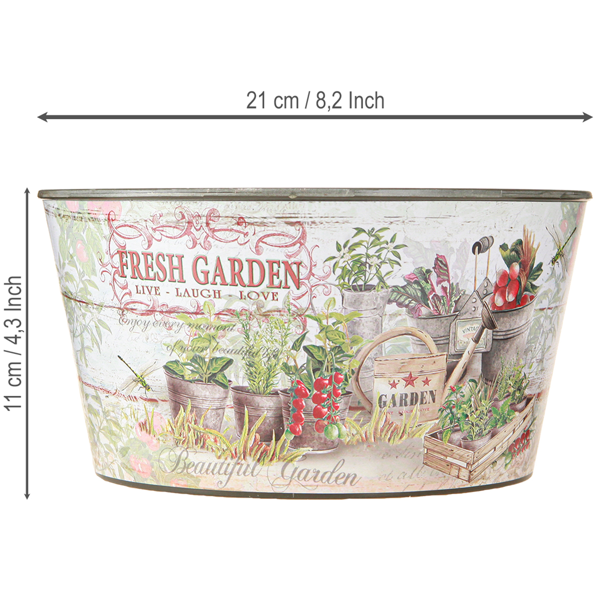 Unsere Blumenschale im Vintage-Stil und aus hochwertiger Plastik mit dem Schriftzug "Fresh Garden" ist die perfekte Ergänzung zu Ihrer Outdoor- und Indoor-Dekoration. Mit einem Durchmesser von etwa 21 cm und zu zwei Stück sind die Schalen ideal für Liebhaber des Vintage-Charmes. Die farbenfrohe Gestaltung in Kombination mit einem Motiv, das Gartengeräte, Pflanzkübel, Obst- und Gemüsepflanzen sowie Kräutertöpfe zeigt, bringt Frühlings- und Sommerstimmung in Ihr Zuhause oder Ihren Garten. Der Schriftzug "Fresh Garden – Live – Laugh – Love" ist in stilvollem Vintage-Design gehalten und fügt sich harmonisch in Ihre Tischdeko für den Frühling oder für den Sommer ein. Hergestellt aus hochwertigem Kunststoff, sorgt diese Blumenschale nicht nur für optische Highlights, sondern ist auch langlebig und robust. Ob als Blumentopf, Pflanzkübel oder Kräutertopf, unsere Blumenschalen strahlen eine einladende Garten- und Balkondekoration aus.