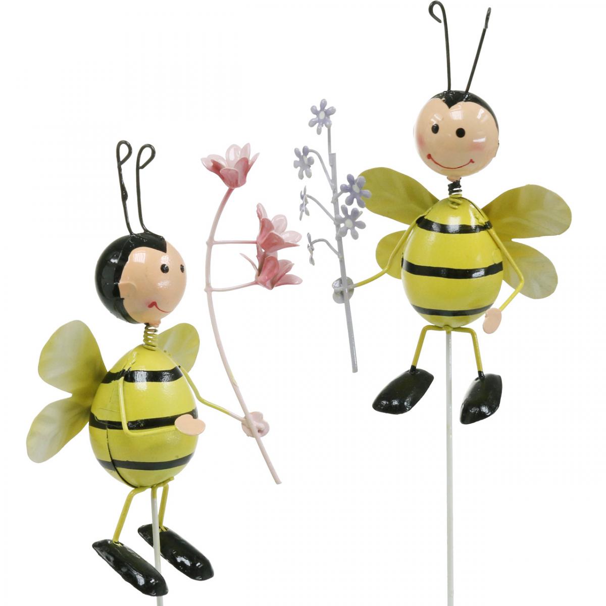 Di fiore in fiore, di fiore in fiore. Questi tappi per fiori ape con fiore sono gli elementi decorativi giusti per la primavera e l'estate. Queste quattro piccole api felici sono fatte di metallo, così come il bastone su cui sono sedute.Indossano un vestito a righe gialle e nere, scarpette nere e un cappellino nero. Anche le ali gialle sul dorso e le antenne nere sulla testa sono adorabili. Due figure di api tengono nella mano sinistra un fiore rosa con tre boccioli. Le altre due figure reggono nella mano destra un fiore lilla con sei piccoli petali.