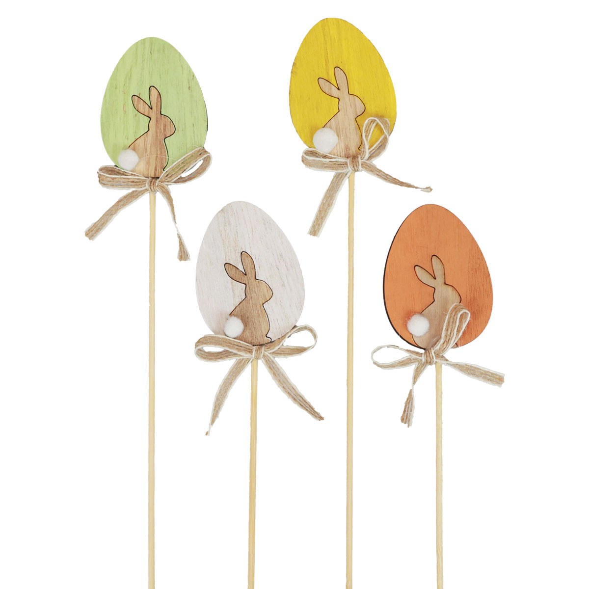 Tappi per fiori Decorazione pasquale Uovo in legno con coniglietto colorato 5×7 cm 12 pz