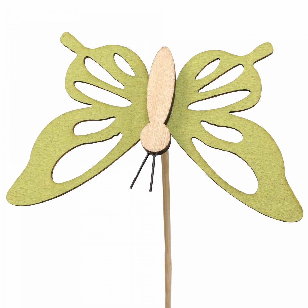 Illumina il tuo arredamento primaverile con queste splendide borchie a fiore farfalla in rosa, giallo, verde e arancione! La bella decorazione a farfalla in legno ha una molla a spirale in modo che la figura possa oscillare facilmente avanti e indietro sul tappo del fiore.Le farfalle in legno sono dipinte su un lato, mentre il corpo è di colore naturale. Le antenne nere sono in filo metallico, così come la molla a spirale che collega la falena e l'asta sul dorso.