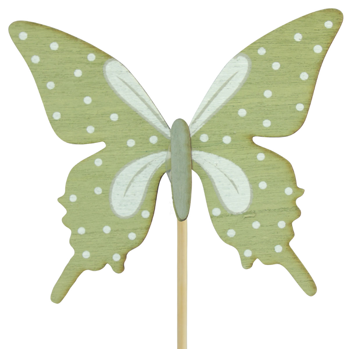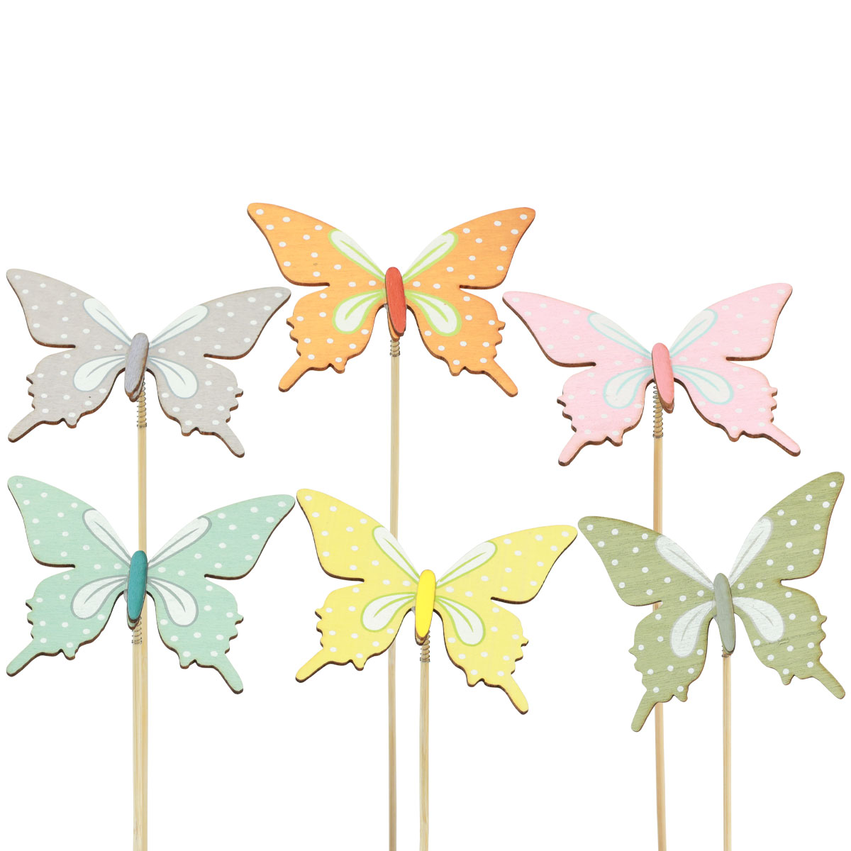Sie erhalten die Dekostecker mit Schmetterling einseitig bemalt und 6-fach sortiert. Die Flügel tragen je nach Figur die Farben Blau, Rosa, Grün, Orange, Gelb oder Grau. Die Flügel sind verziert mit weißen Punkten und einem Muster.
