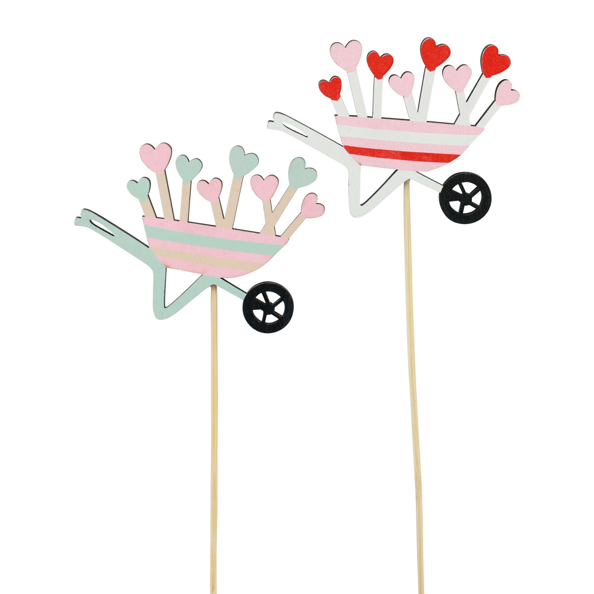Sie erhalten die Blumenstecker mit Schubkarre und Herzen auf dem Holzstab zu 12 Stück, 2-fach sortiert.