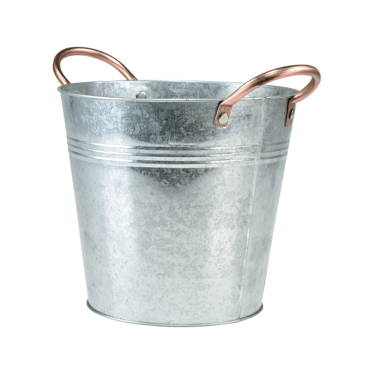 Un accattivante contrasto di diversi metalli è creato dai manici color rame di questo secchiello in metallo. La superficie galvanizzata e argento lucido conferisce alla fioriera un discreto aspetto vintage. Prima di piantare, è consigliabile rivestire il contenitore metallico con un foglio di alluminio per prevenire ruggine e corrosione.
