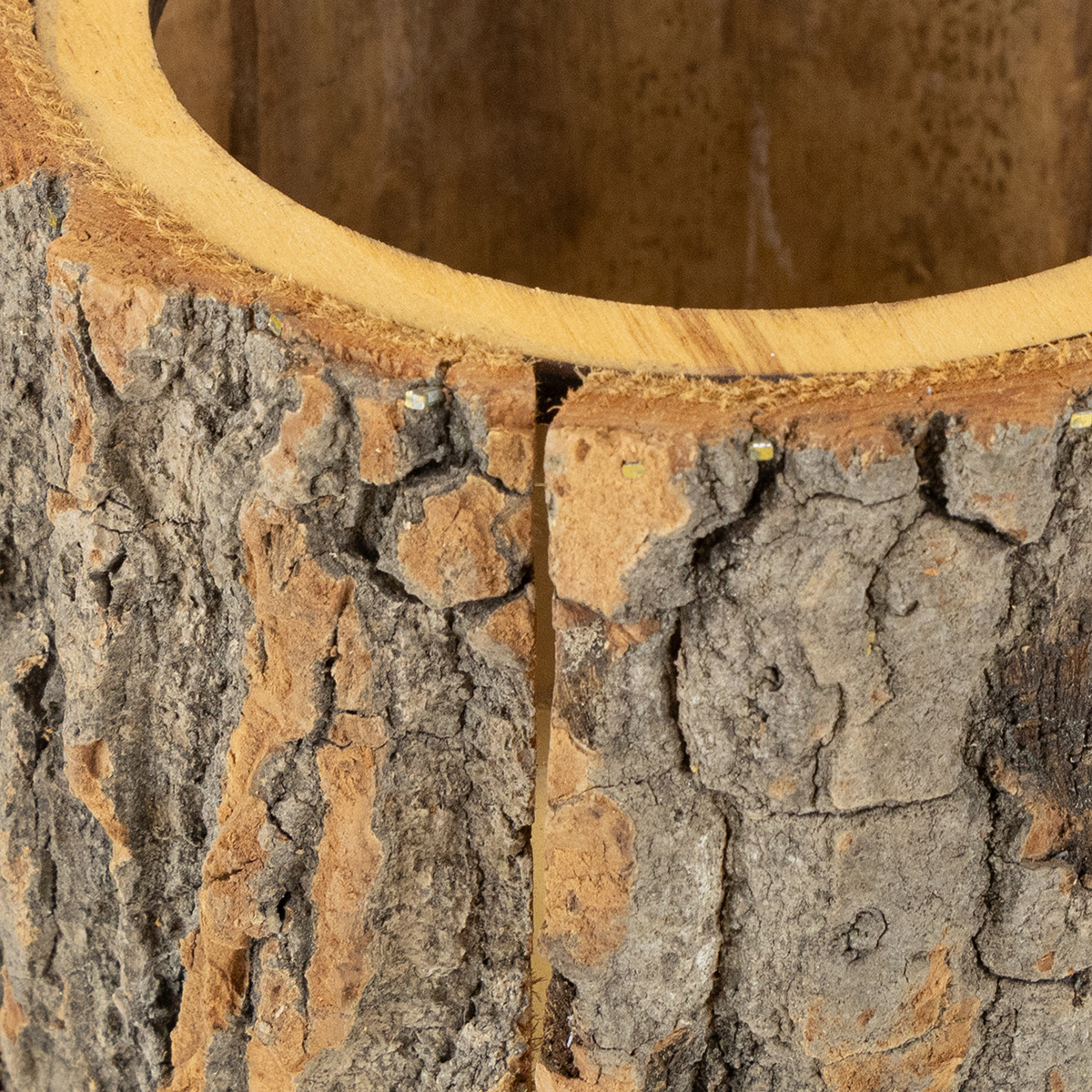 Produktname: Blumentopf Holz Rinde Übertopf Wichtel Edelrost H24cm