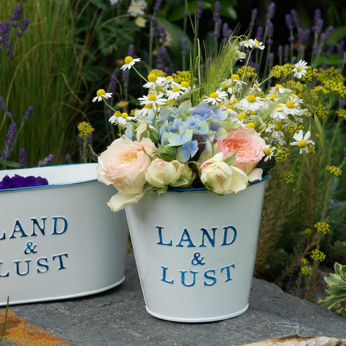 Der kleine Blumentopf in Weiß und Blau lädt dazu ein, mit hellen Farben den Frühling zu feiern. Der Übertopf verbindet frische Farbgebung mit Vintage-Optik, die sich in der Retro-Schrift „Land & Lust“ und leichten Abriebspuren ausdrückt. Wenn Sie den Deko-Topf mit Folie auslegen, können Sie die Metalldeko auch als Pflanzgefäß nutzen.