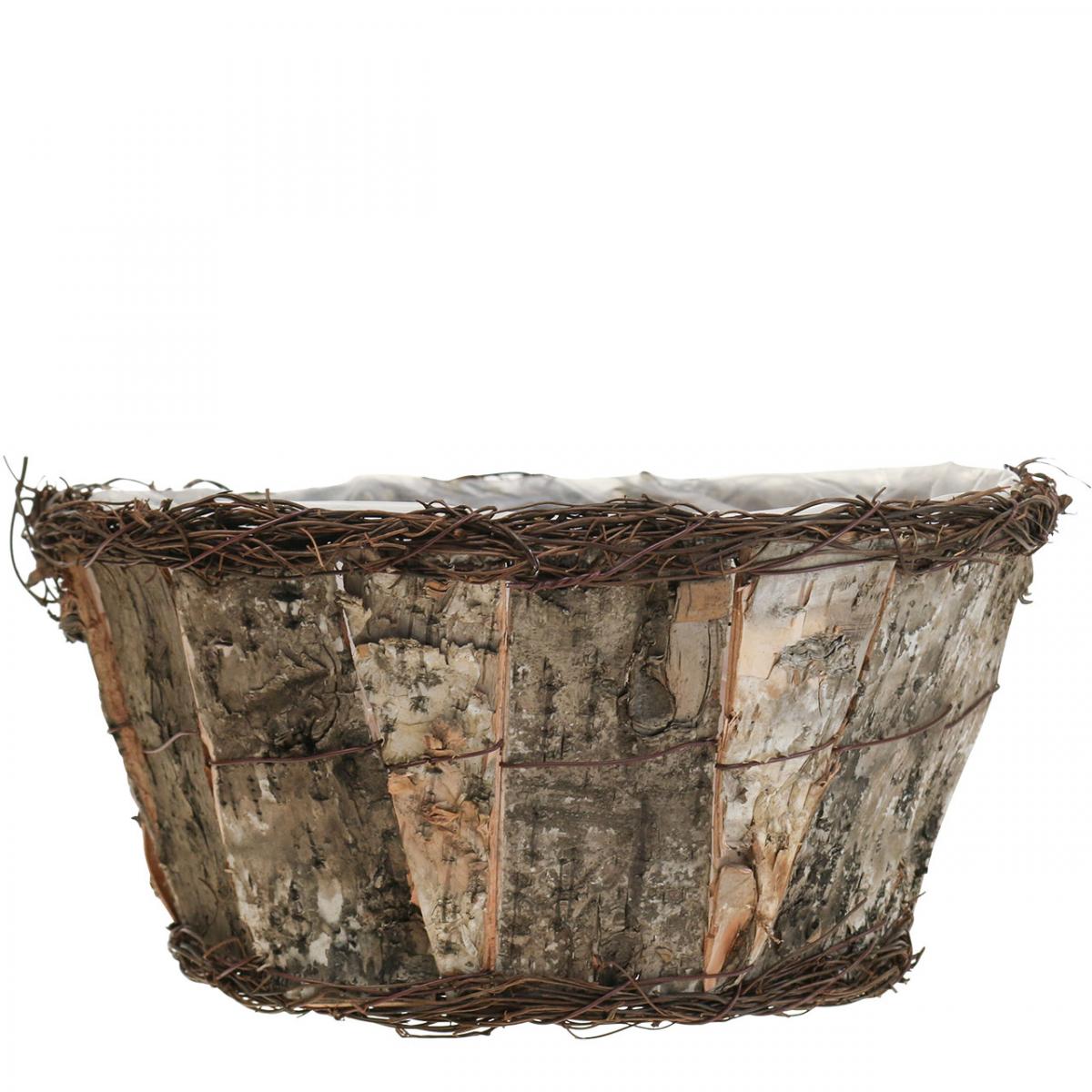 Questo vaso da fiori colpisce per il suo originale effetto legno. Il vaso per piante è rotondo ed è composto da strisce di corteccia di betulla e anelli di viti intrecciate.Tutto intorno la fioriera è decorata con vera corteccia d'albero, che presenta macchie più chiare e più scure. Attorno ad essa sono avvolte due trecce di viti, una sul fondo e una sul bordo del vaso.