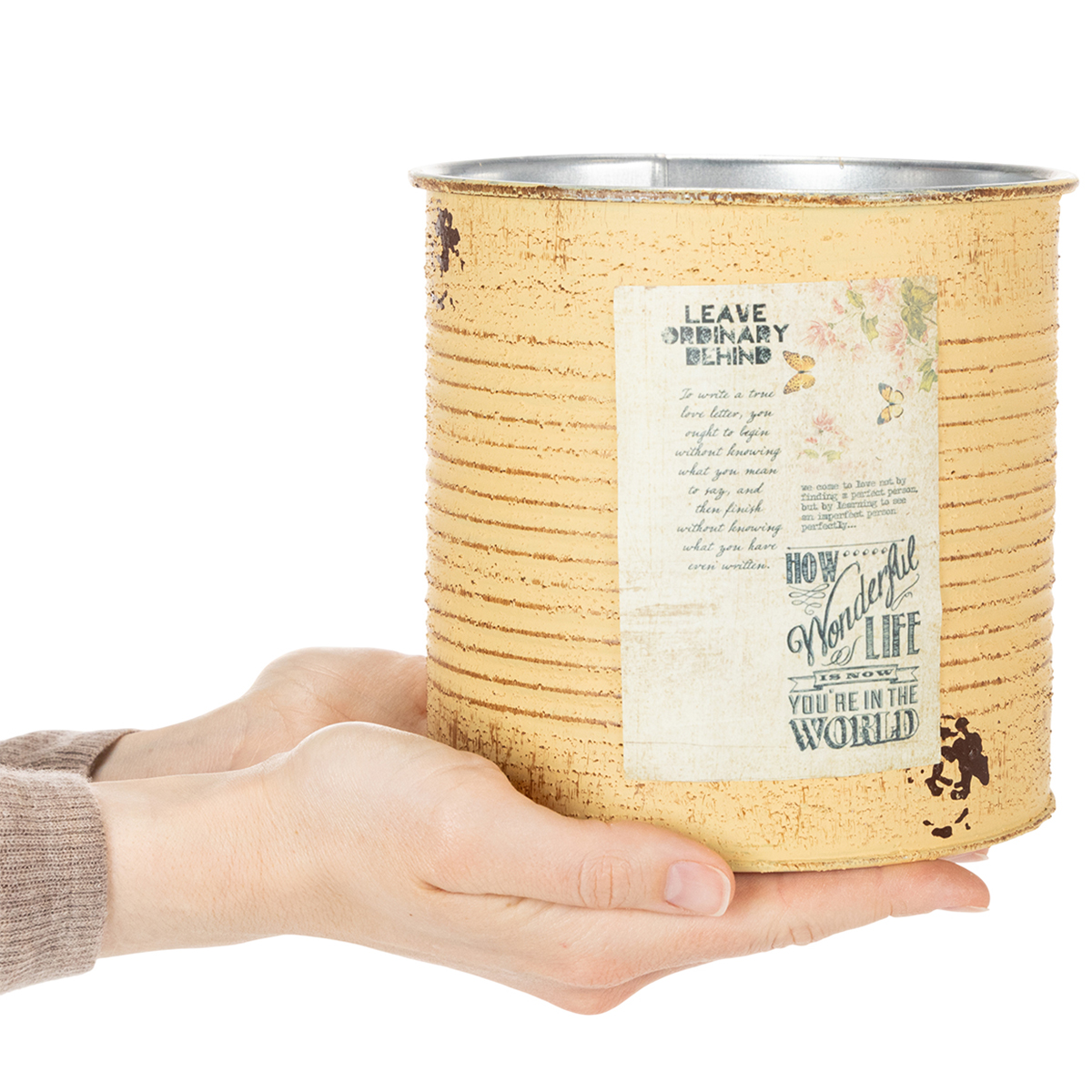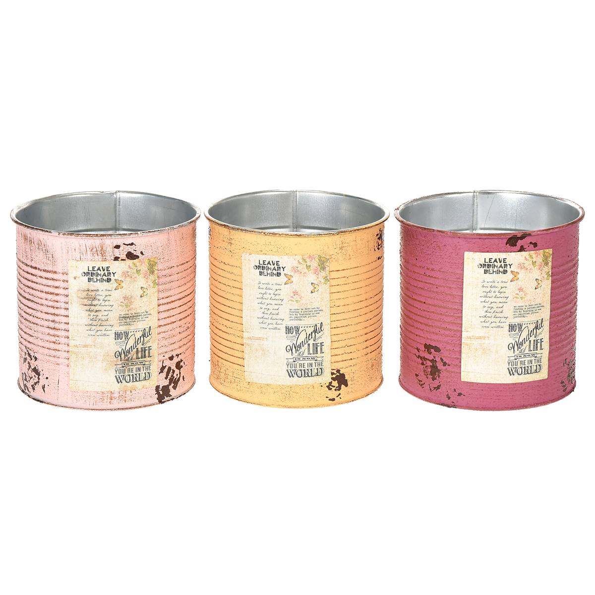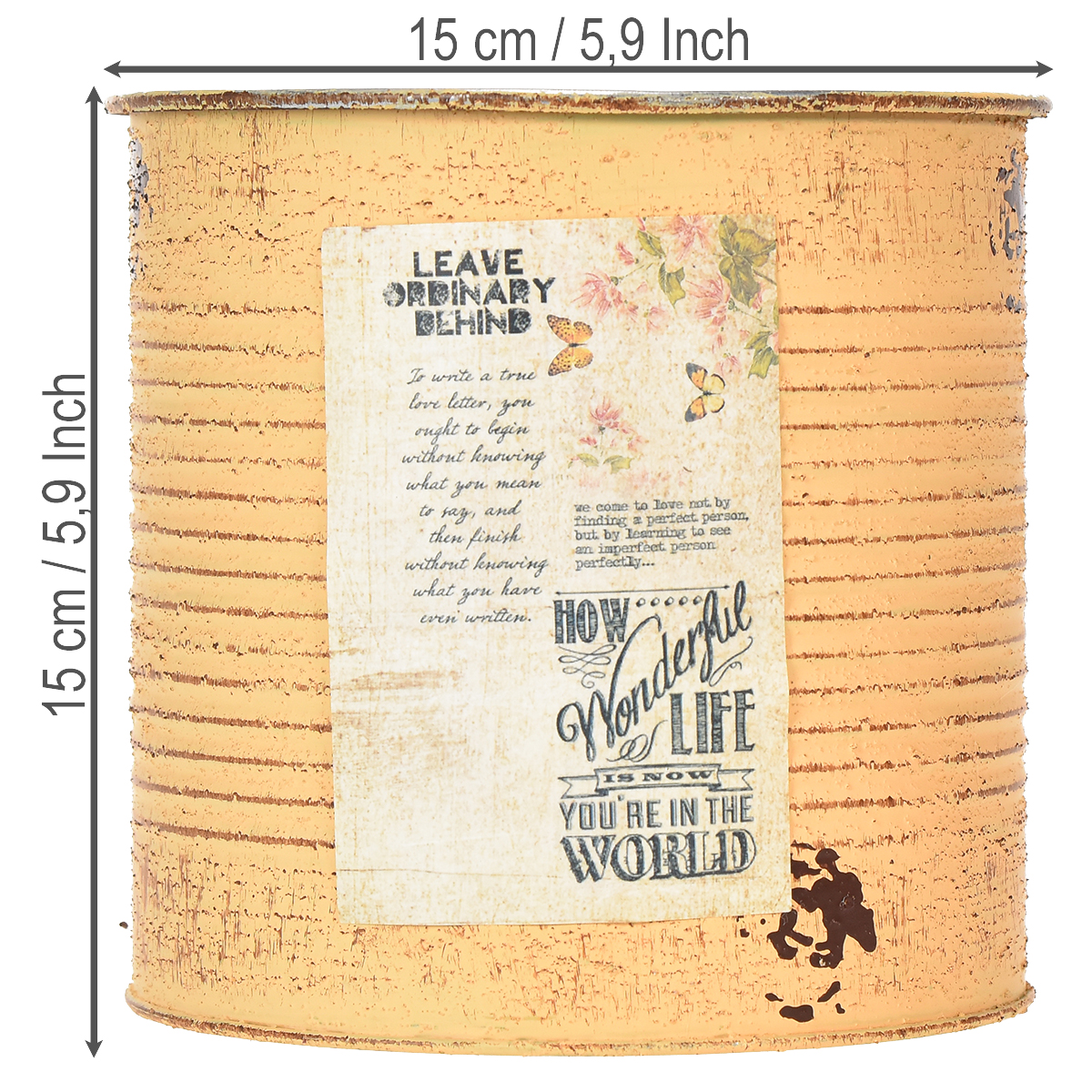 Mit diesem liebevoll gestalteten Blumentopf im Vintage-Look machen Sie jedes Dekorationsprojekt zu einem besonderen Highlight. Dank der Retro-Akzente und auf die Dosen aufgemalten Rostspuren schaffen diese außergewöhnlichen Pflanzgefäße eine gemütliche Atmosphäre – perfekt für den Landhausstil oder ein rustikales Ambiente. Die Kombinationsmöglichkeiten sind nahezu unbegrenzt – ob als dekorativer Übertopf für Zimmerpflanzen, mit Folie ausgekleidet als Pflanzdose, als DIY-Vase für Trockenblumen oder Organizer für Stifte und kleine Accessoires. Jede Dose ist 15 Zentimeter hoch und ein wahres Multitalent.