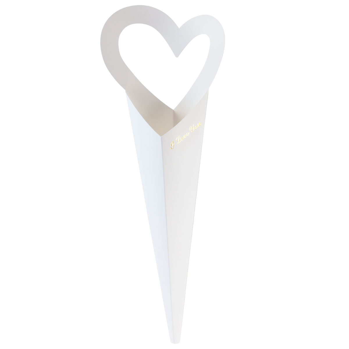 Élégant et original, vous pourrez offrir des roses avec un cœur dans ce sac à fleurs. L'emballage cadeau blanc est en carton.L'emballage floral blanc et élégant offre un fort contraste avec les roses rouges et l'inscription dorée « I Love You » dit ce qui se passe de manière élégante. Le sac à fleurs peut être déplié pour créer un cône pointu inversé qui constitue le support idéal pour les roses à longues tiges.