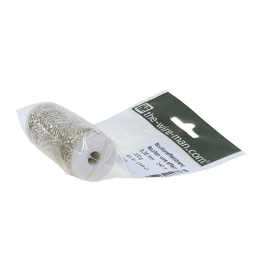 Le fil effet bouillon en argent mesure environ 0,30 millimètres de diamètre et mesure environ 140 mètres de long (il est enroulé autour d'une bobine plastique). La bobine dispose d'une ouverture en son centre, vous pouvez donc accrocher votre bobine dans votre atelier et dérouler le fil sans encombre. Au total, le rouleau pèse environ 100 grammes.