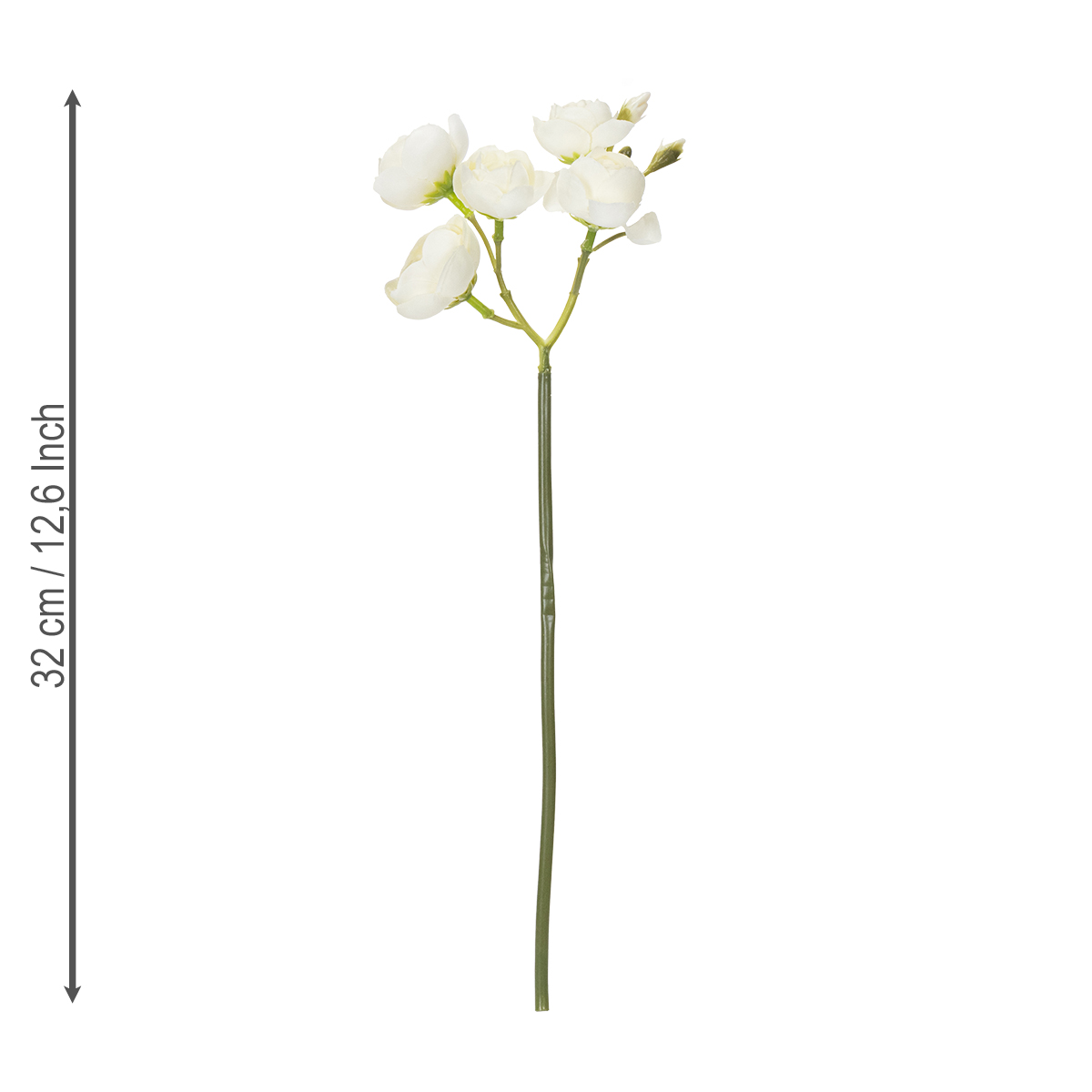 Un fresco tocco di primavera tutto l'anno? Perché no! Questo bouquet di ranuncoli artificiali in un bianco radioso porta in casa un'elegante decorazione floreale che non appassisce mai e non richiede manutenzione. È particolarmente efficace in soggiorno, sul davanzale della finestra o come accento accattivante in ufficio. Alto 32 cm e con cinque steli, crea un aspetto autentico quasi indistinguibile dai fiori veri. Questi fiori artificiali sono perfetti per chi ama il fascino naturale del ranuncolo e allo stesso tempo apprezza la bellezza duratura. Una vera meraviglia decorativa, abbastanza versatile da poter essere utilizzata in una varietà di ambienti.