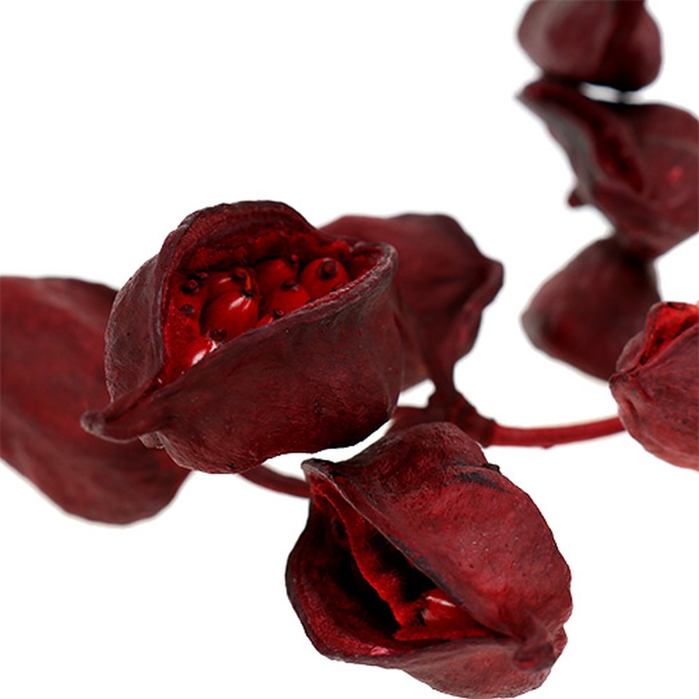 Vous cherchez pour votre prochaine décoration de Noël un accessoire rare et aux connotations exotiques qui pourrait être exposé dans une coupe ? Alors craquez pour ces coques de Brachychiton de couleur rouge ! Ces petits fruits en forme de barque sont regroupés en différentes branches, ils ont été séchés avec soin et teintés d’un beau rouge grâce auquel ils vont instaurer une atmosphère lumineuse et très sereine.Les coques de Brachychiton sont légèrement ouvertes et laissent entrevoir les quelques graines qui y restent encore et qui ont également été colorées en rouge pour renforcer encore plus le rôle décoratif de l’ensemble. Vous pourrez exposer ces ravissants fruits naturels sur une commode dans une coupe en bois mais aussi les intégrer à une couronne de l’Avent et à un arrangement festif ou encore les disposer à la surface de vos jardinières et pots de fleurs.