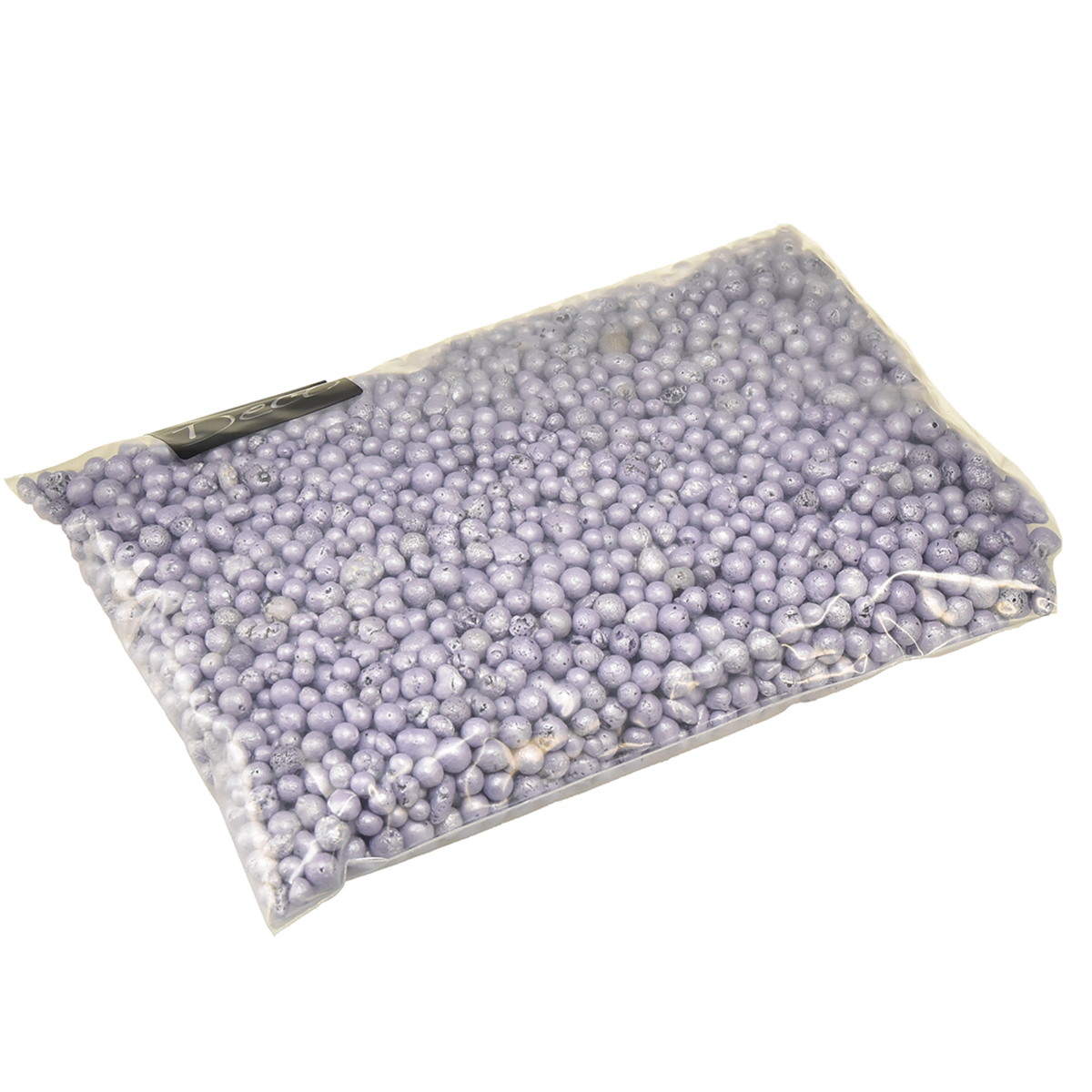 Le sachet en plastique dans lequel sont livrées nos pertes décoratives mauves contient 1 litre de granulés dont la taille oscille entre 4 et 8 mm.