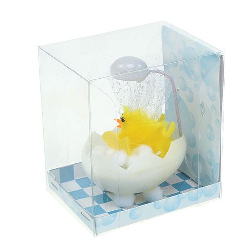 Il pulcino di ciniglia gialla in bagno è lungo circa 8,5 centimetri con il display di cartone e ha una doccia oltre al bagno, in cui galleggia schiuma di batuffoli di cotone bianco, dall'acqua, qui mostrata da tessuto di organza, arriva. Il pesce, le ali gialle e il becco arancione sono fatti di feltro e completano la deliziosa immagine del pulcino pasquale con gli occhi neri.