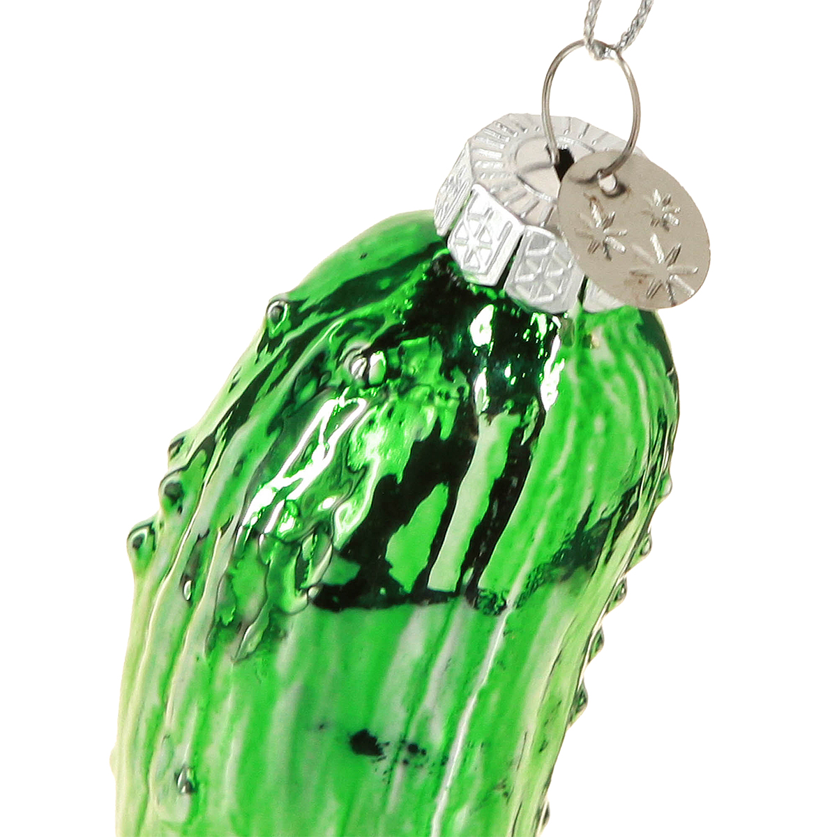 La decorazione dell'albero di Natale Il cetriolo di Natale è lungo circa 8 centimetri e largo circa 3 centimetri. Il gancio per albero di Natale in vetro ha un occhiello in metallo color argento e un nastro dorato rimovibile. Con un nastro argentato per appenderlo e un occhiello, il cetriolo è lungo in totale circa 17 centimetri.