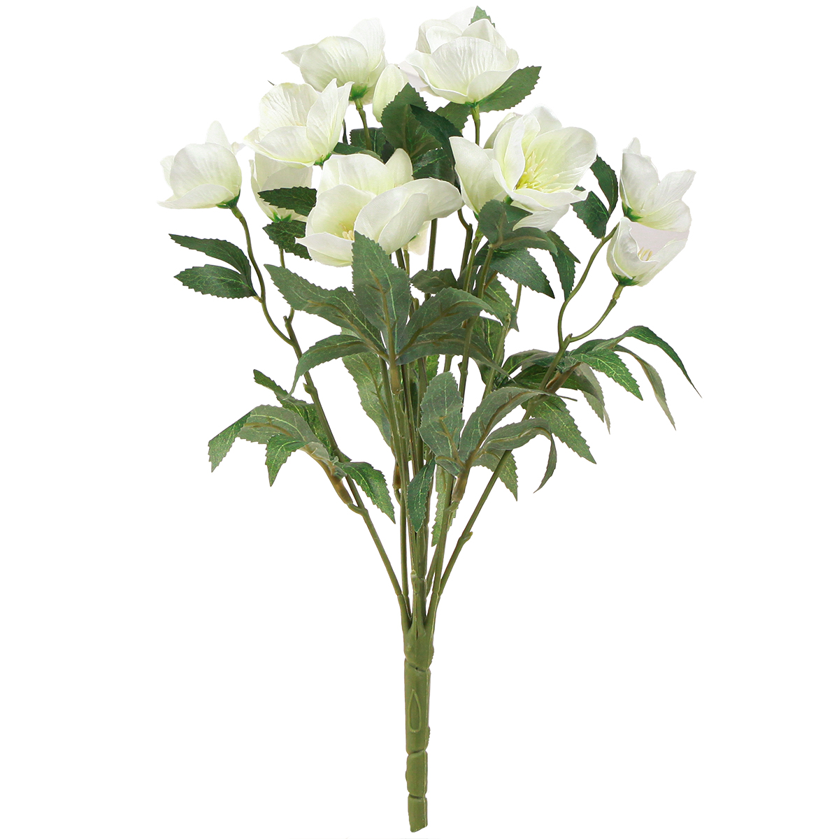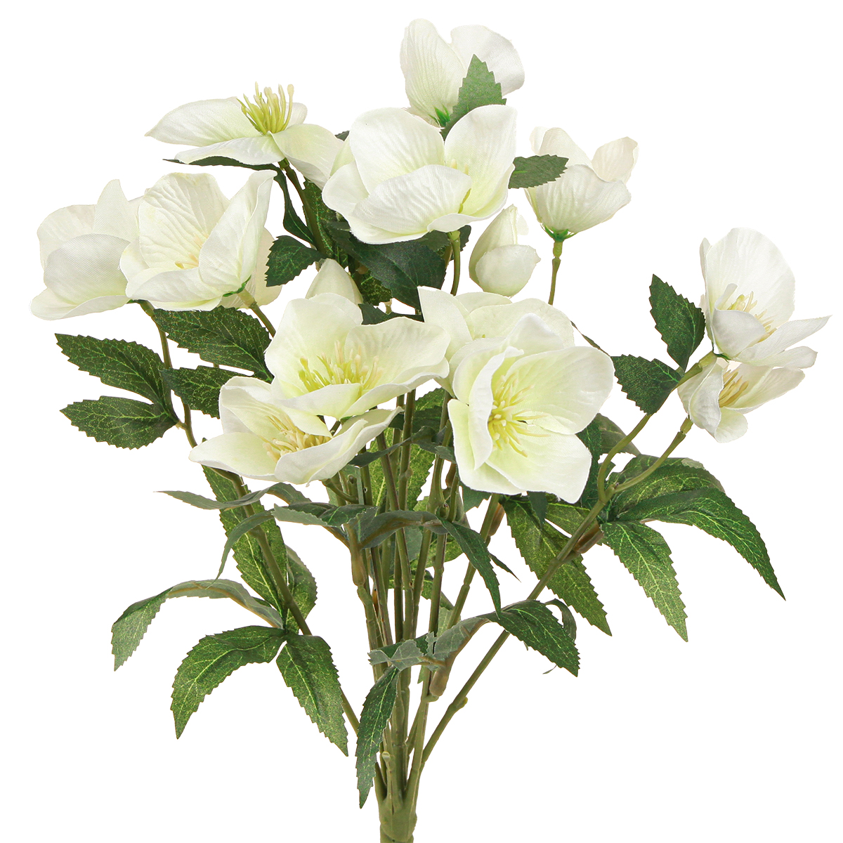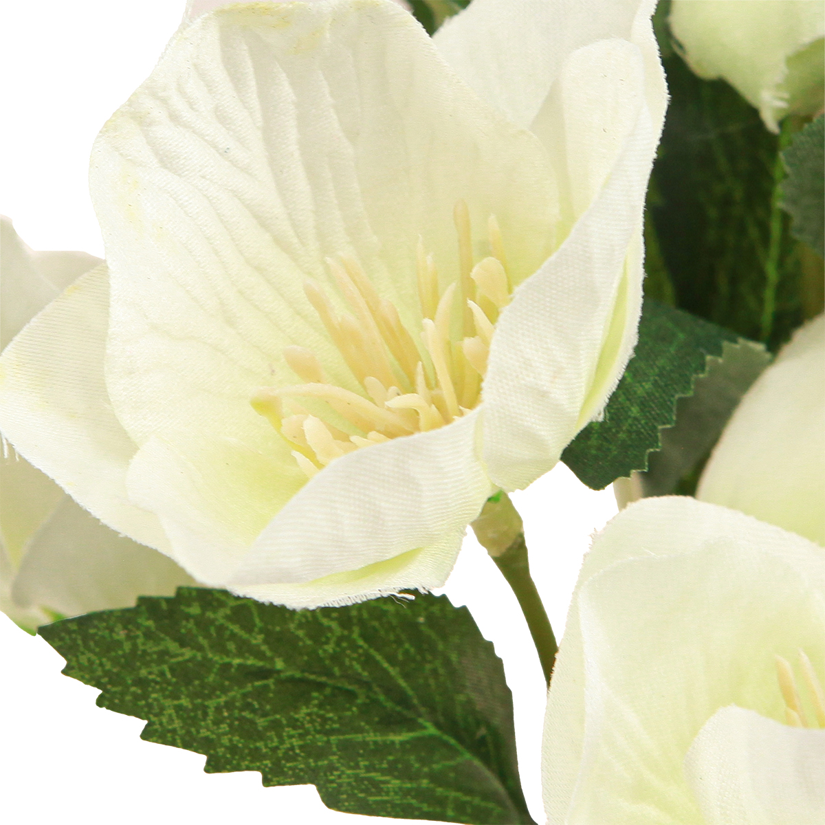 Schmücken Sie Ihr Heim zur Weihnachtszeit mit diesem künstlichen Christrosenstrauß in Creme! Die hübsche Kunstblume besteht aus einem Hauptstiel, aus dem mehrere kleinere Stiele mit Blüten herausragen. Diese sind der echten Christrose, die auch als Schneerose, Weihnachtsrose, Schwarzer Nieswurz und Helleborus niger bekannt ist, originalgetreu nachempfunden und strahlen mit ihrer hellen Cremefarbe eine faszinierende Atmosphäre aus.Durch den breiten Stiel können Sie die Kunstpflanze beispielsweise sehr schön in eine hübsche Keramikvase und diese dann auf einen Wohnzimmertisch, eine Kommode oder auch einen Fenstersims stellen. Fügen Sie ruhig noch ein Weihnachtsband und einen Blumenstecker hinzu oder hängen Sie ganz pfiffig eine kleine Weihnachtskugel und eine Lichterkette an die Deko-Blume und kreieren Sie somit eine außergewöhnliche und zeitgemäße Weihnachtsdekoration! Außerdem können Sie die künstliche Rose mit weiteren Kunstblumen zu einem großen Blumenarrangement verarbeiten.