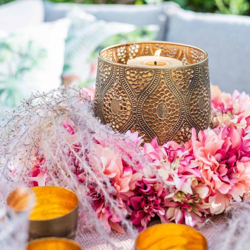 Einfach aber wirkungsvoll: dieser Dahlienblütenkranz der Edelmarke VIANA sorgt für einen wahren Blütenrausch in der Tischdeko oder als Wandschmuck. Der Blumenkranz besteht aus einem Styroporring als Basis, an dem die hochwertigen Seidenblumen fest angebracht sind.Für eine stilvolle Blumendekoration auf dem Tisch, legen Sie den Kranz aus Dahlien einfach in die Mitte. Mit einem Windlichtglas und Kerze zusammen arrangiert ergibt sich ein opulentes Centerpiece. Wenn Sie den Seidenblumenkranz als Wand- oder Türschmuck verwenden möchten, dann können Sie ganz leicht eine Aufhängung aus Dekobändern zaubern. Mit einem einfarbigen Schmuckband bleiben Sie dezent, ein romantisches Spitzenband hingegen zaubert eine gewisse Glanznote hinein.