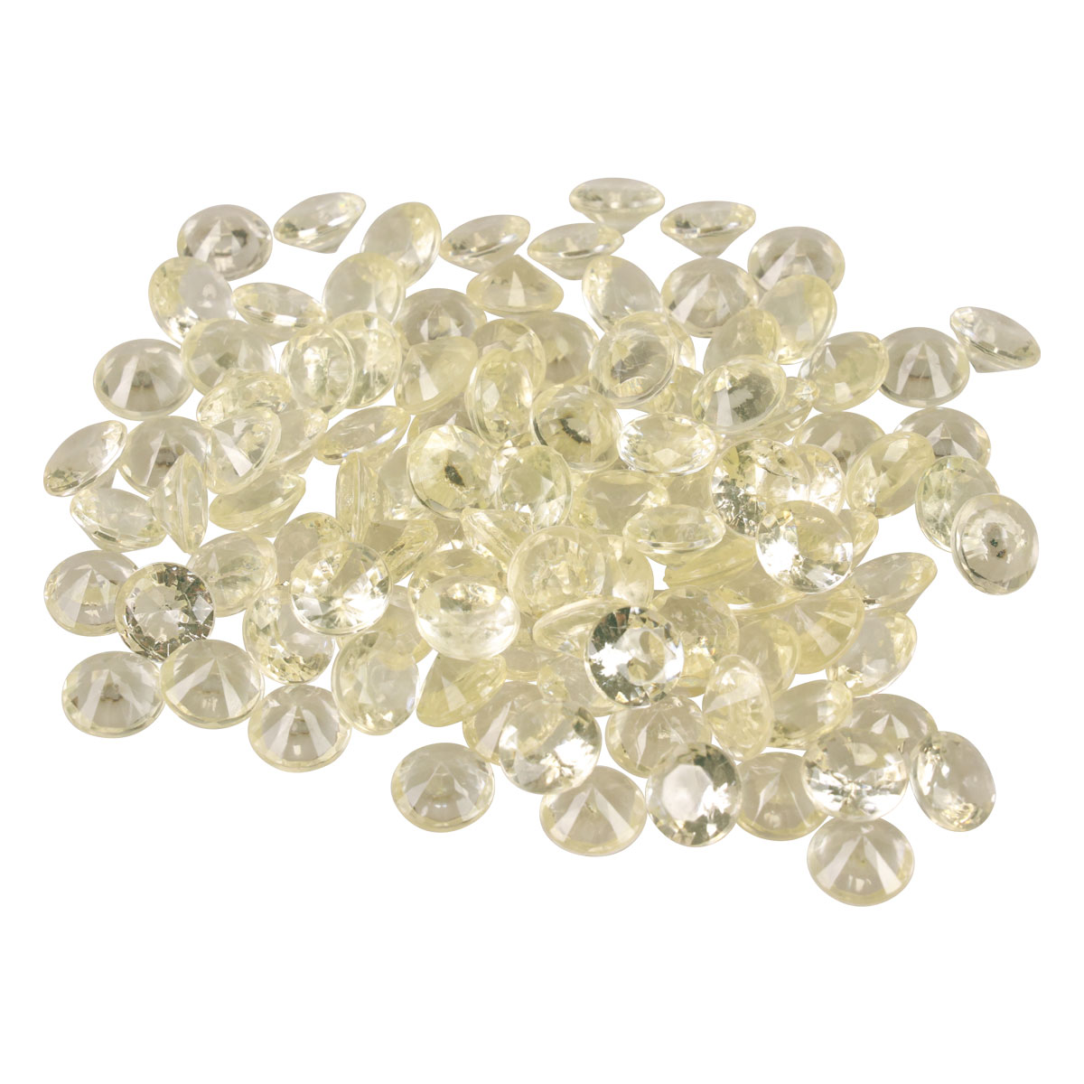 Die Deko-Diamanten besitzen alle eine Größe von um die 12 Millimetern Durchmesser. Die Diamanten-Steine zur Deko sind durchsichtig mit leicht gelblicher Färbung, sodass die Deko-Diamanten aus Acrylglas an perlenden Champagner erinnern.