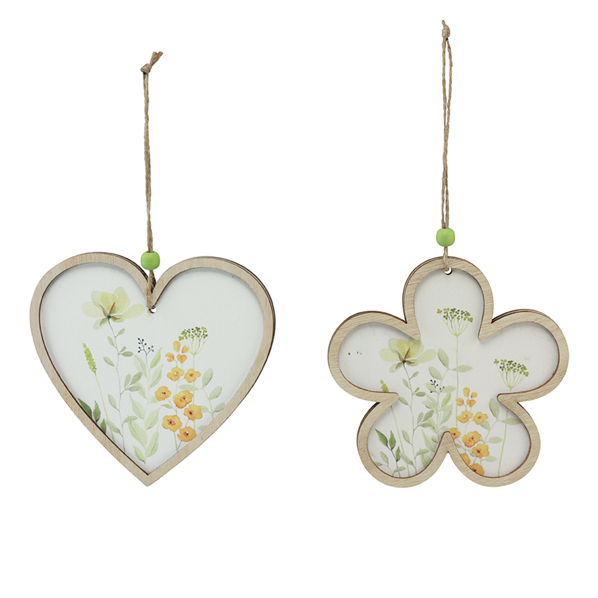 Questi bellissimi pendenti decorativi con motivo floreale sono ideali per portare un tocco d'estate nella tua casa.Tre pendenti ciascuno hanno la forma di cuori e fiori. La decorazione vintage è in legno e presenta un cordone di iuta con una perlina di legno verde. Il delicato motivo floreale è disegnato con cura e riporta alla mente i ricordi di prati fioriti colorati. Il bordo in legno è alto 5 mm e crea accenti molto particolari.