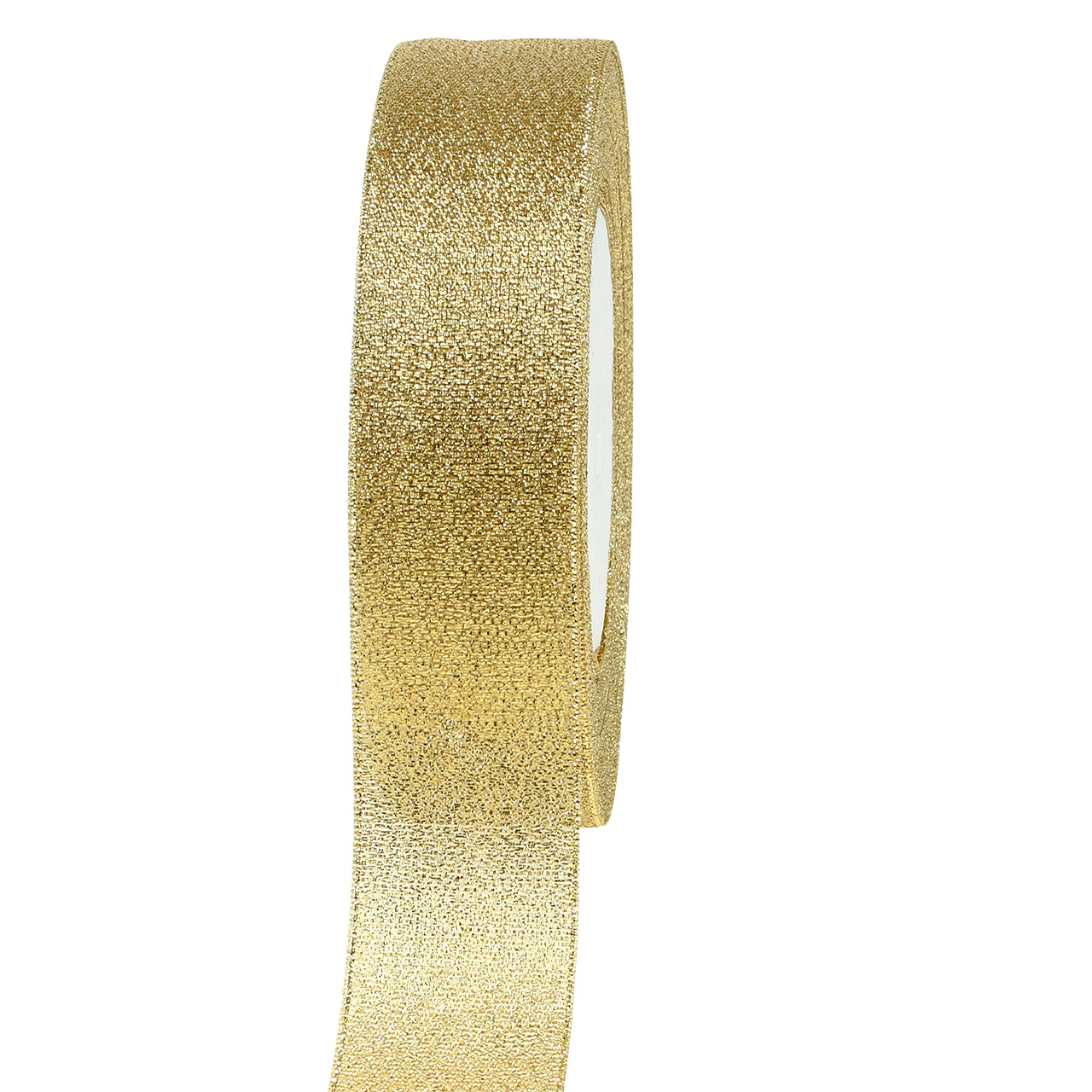Sie erhalten das Dekoband in Gold mit Glimmer-Fäden auf einer flachen, leicht verstaubaren Kunststoff-Spule. Das Geschenkband ist bei einer ungefähren Länge von 22,5 Metern circa 25 Millimeter breit.