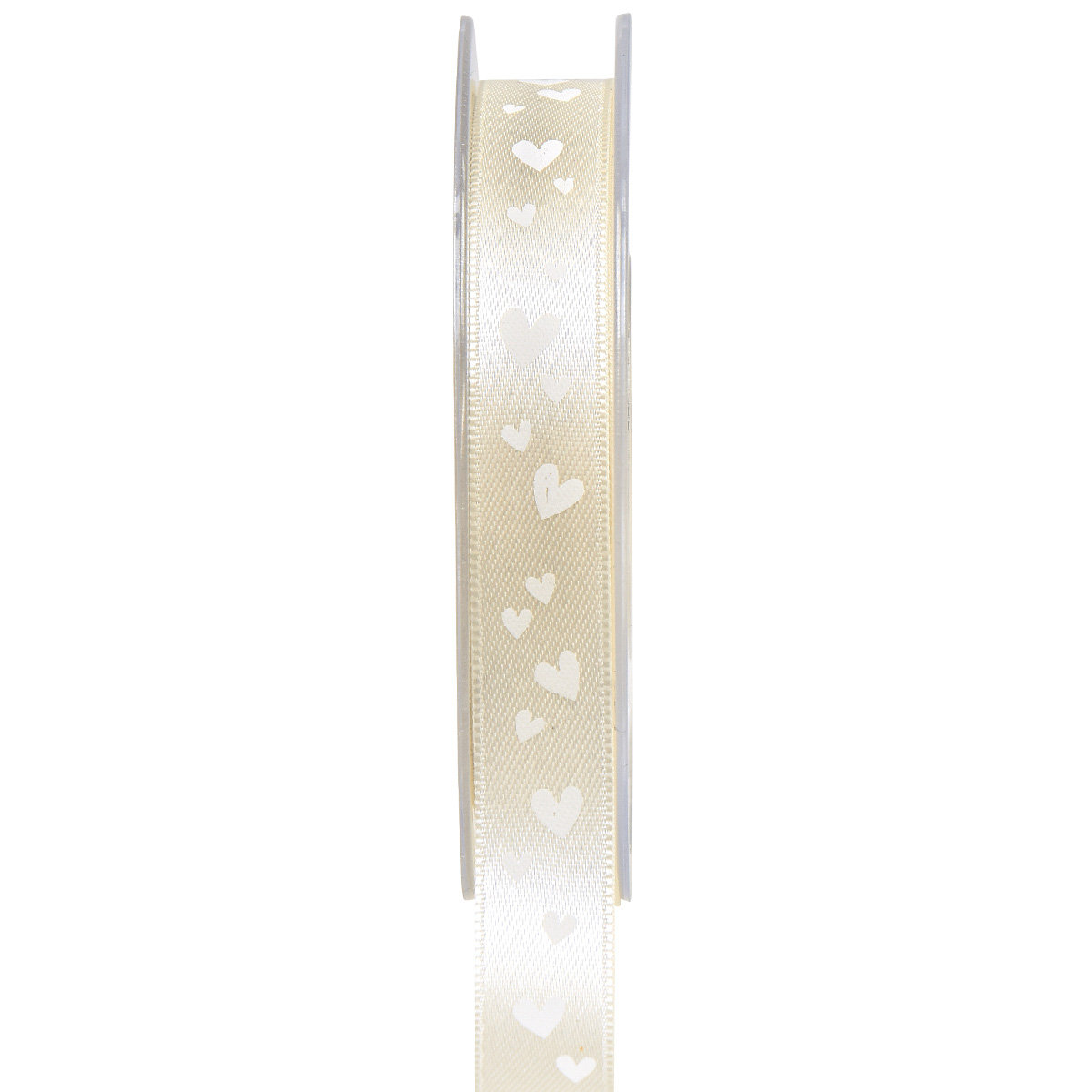 Das schmale Geschenkband hat einen seidigen Glanz und ist mit weißen Herzen bedruckt, die sich zart vom cremefarbenen Stoff abheben. Die hohe Qualität des romantischen Dekobands zeigt sich auch in den Webkanten, die ein Ausfransen unmöglich machen und das Band stilvoll abschließen.