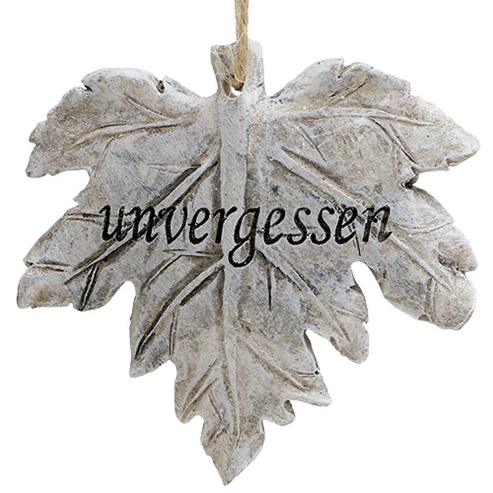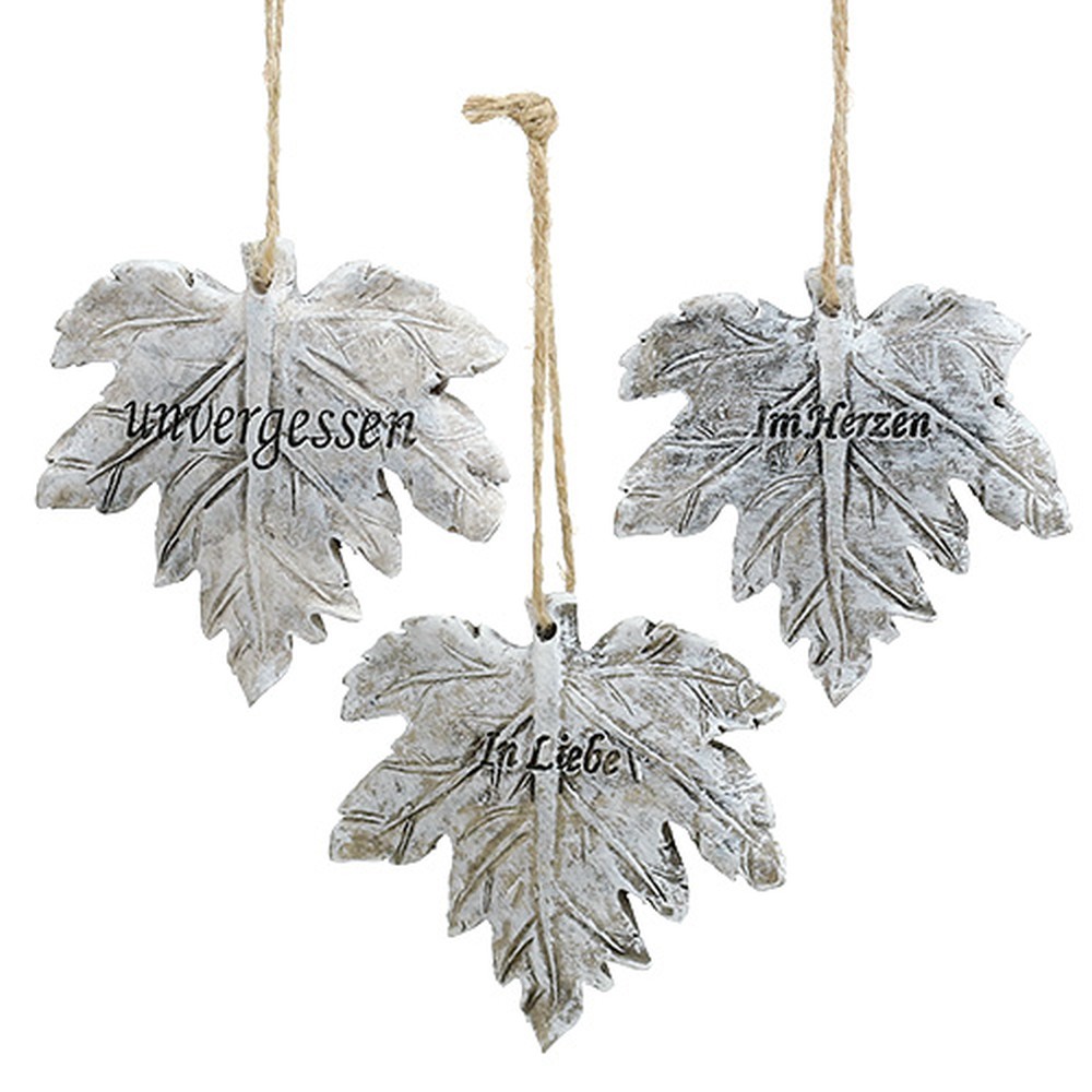 Die Deko-Blätter in Grau mit Spruch sind sehr detailreich und naturnah als Ahornblätter gestaltet. Die Laubblätter zum Hängen besitzen jeweils ein Loch am Stielansatz und sind bereits mit einem Juteband ausgestattet. Jedes Blatt ist mit einem von drei unterschiedlichen Gedenksprüchen graviert. – Auf ihnen stehen: „unvergessen“, „In Liebe“ oder „Im Herzen“. Die künstlichen Blätter können sowohl als Teil einer Trauerdekoration zu Hause, als auch in der Gedenkfloristik oder als fester Grabschmuck zum Beispiel an eine Grablaterne oder Grabvase gebunden eingesetzt werden.