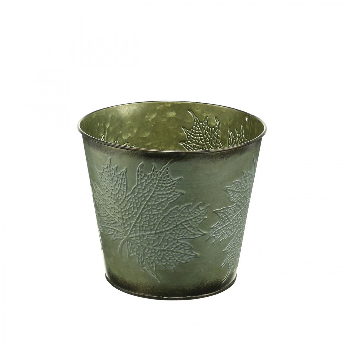 Produktname: Deko-Eimer mit Blattdekor, Herbsttopf, Metalldeko Grün Ø17cm H14,5cm