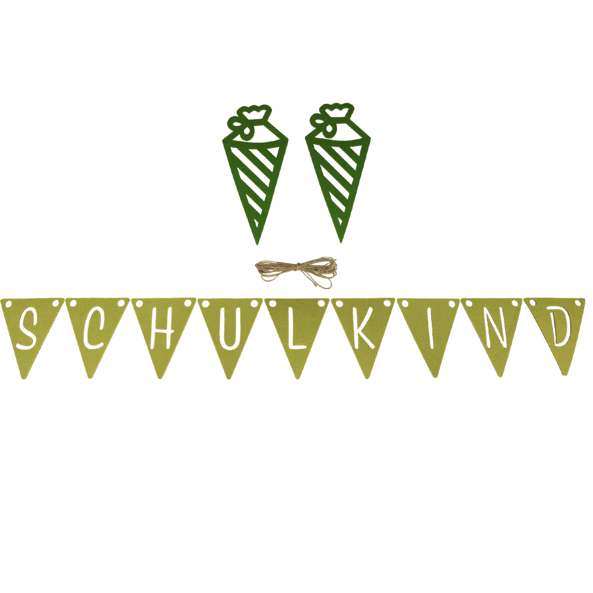 Sie erhalten das DIY-Set für die Einschulung zum Selbstbasteln in einer Tüte zu neun Wimpeln und zwei Schultüten aus Filz und einer langen Jutekordel.